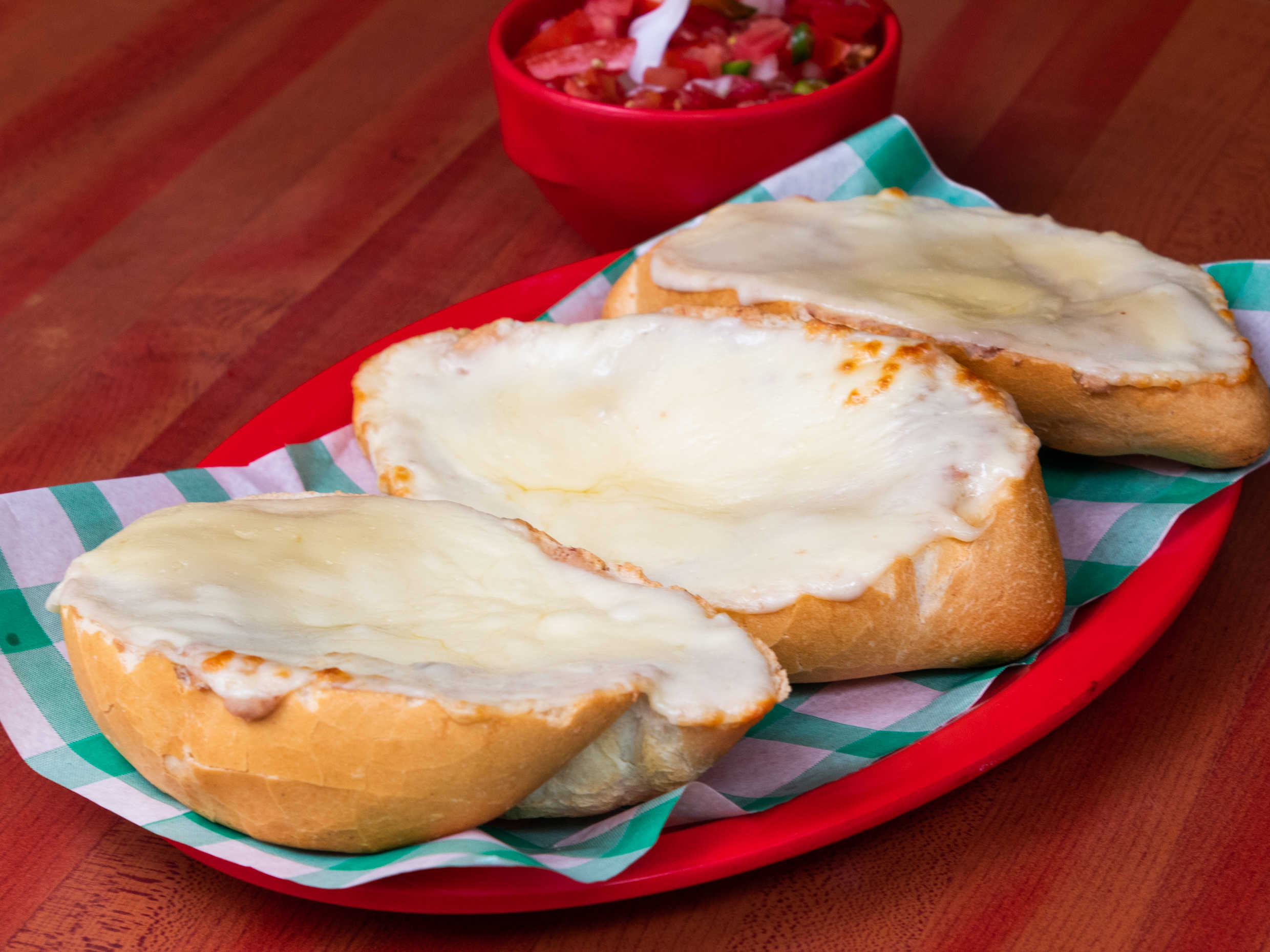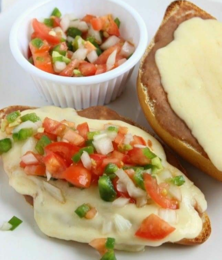 Orden de tres piezas, molletes con atún y queso manchego, incluye salsa de pico de gallo.
