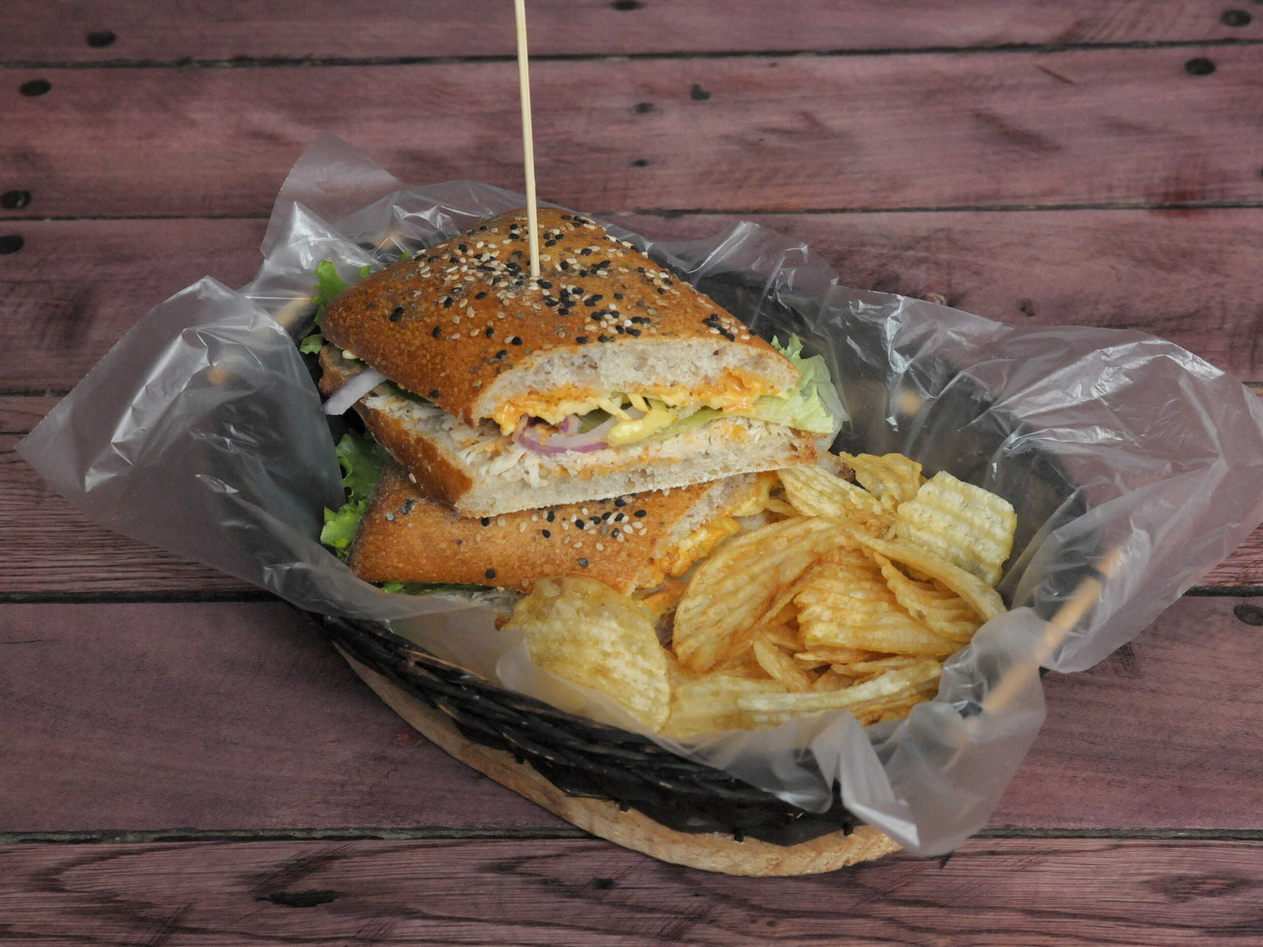 Preparada con queso manchego, queso crema, panela, acompañada de aderezo de chipotle, lechuga italiana, jitomate, cebolla morada, guarnición de papas fritas onduladas.