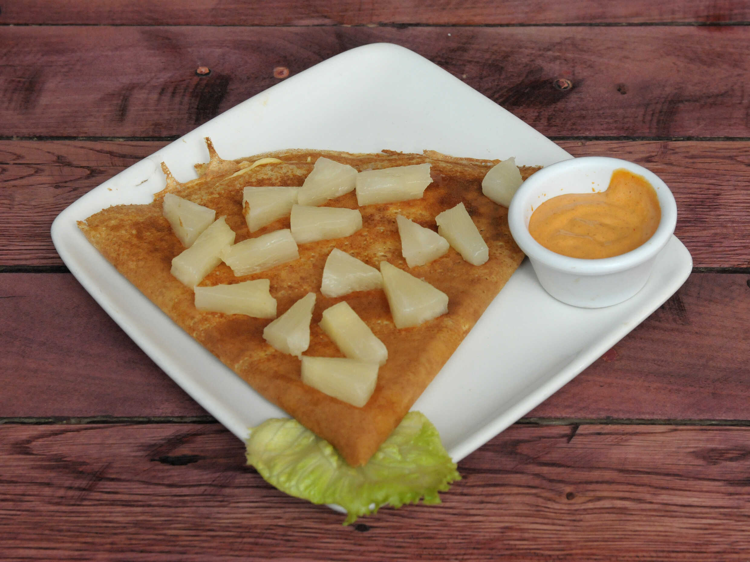 Preparada de pechuga de pavo con queso manchego, pepperoni y piña con aderezo.