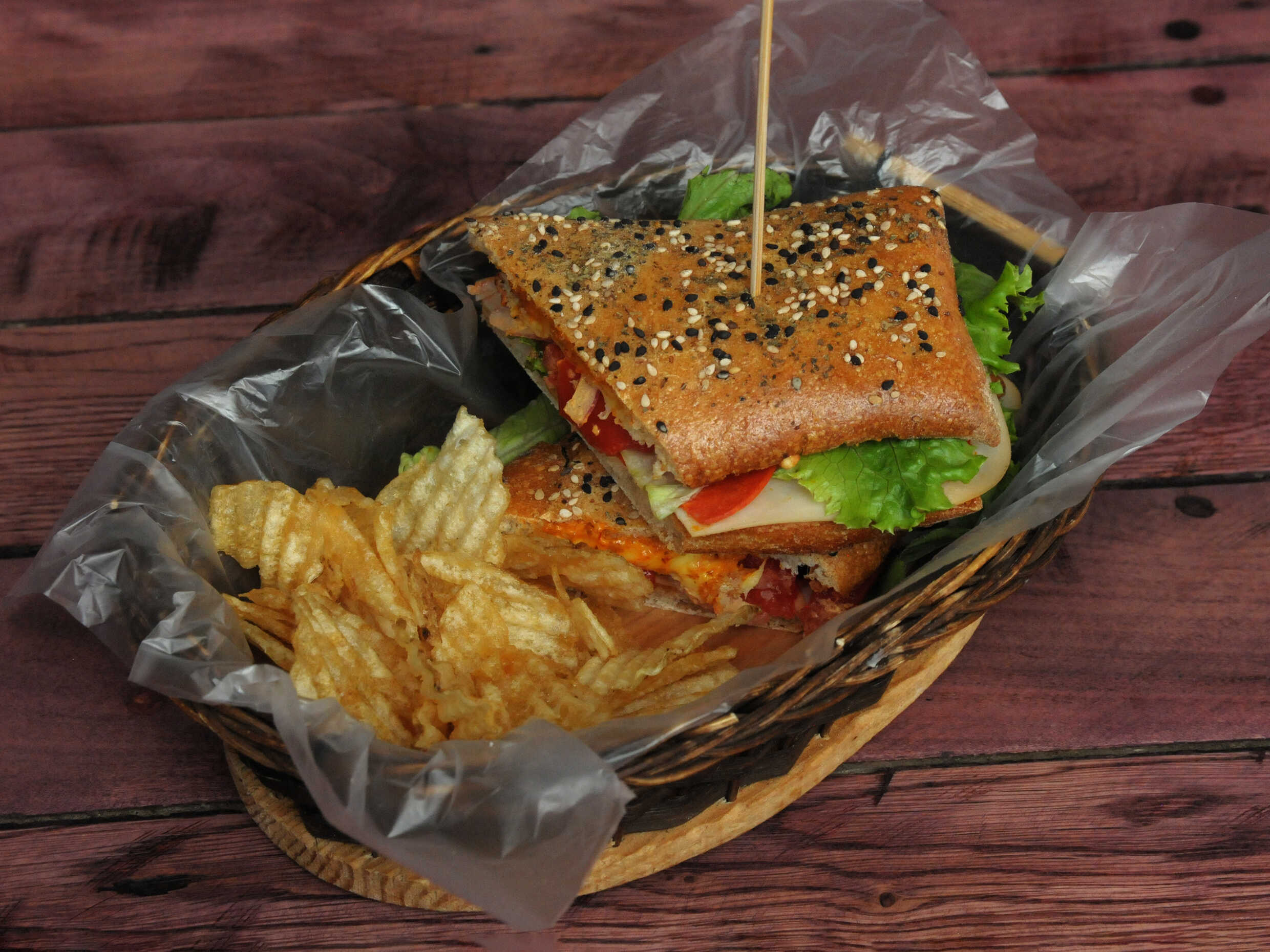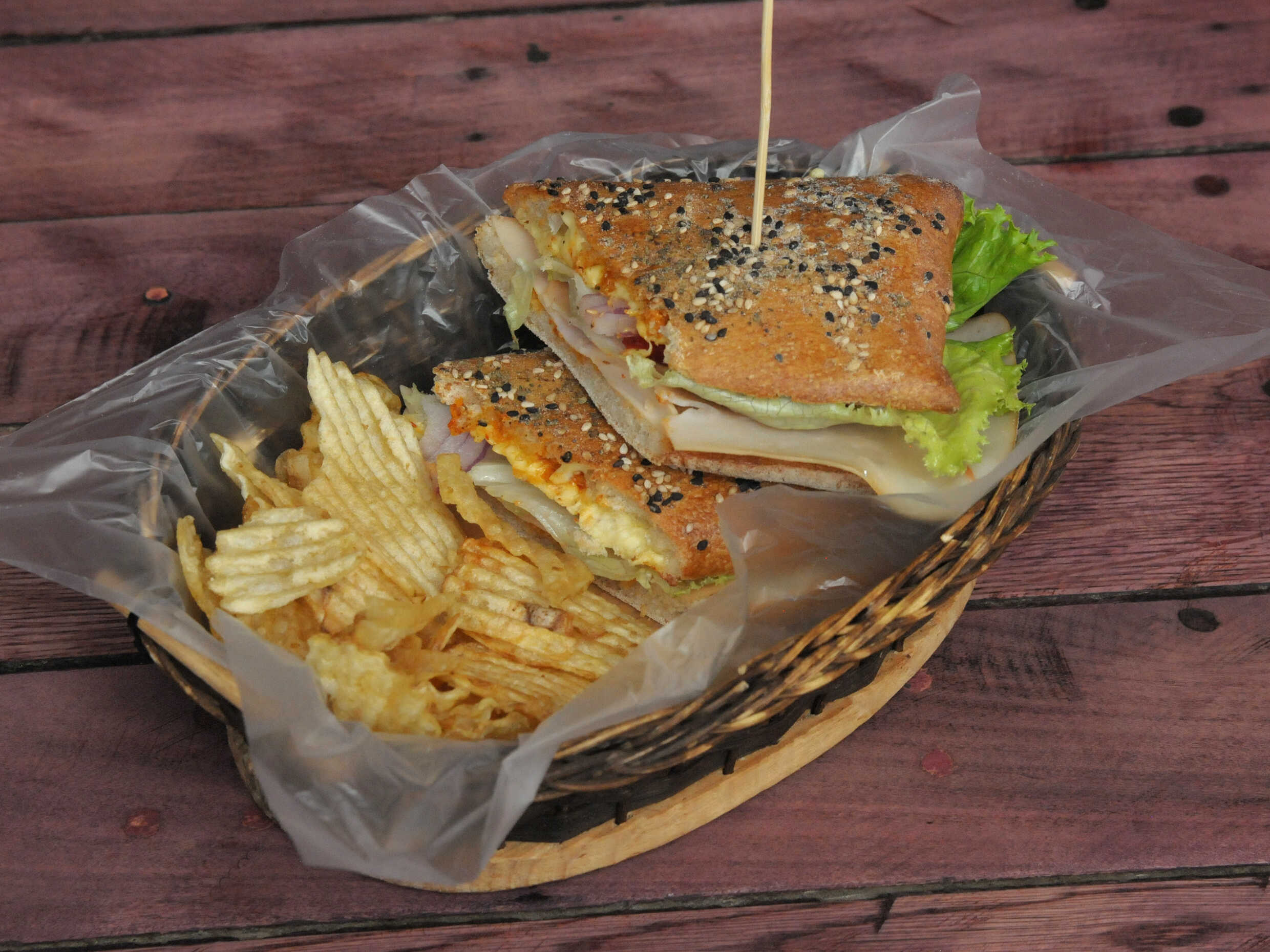 Preparada de pechuga de pavo con queso manchego, acompañada de aderezo de chipotle, lechuga italiana, jitomate, cebolla morada, guarnición de papas fritas onduladas.