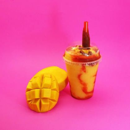 Bebida fría a base de hielos, mango, base,edulcorante,agua purificada, chamoy y tajín, banderilla de tamarindo para decoración.