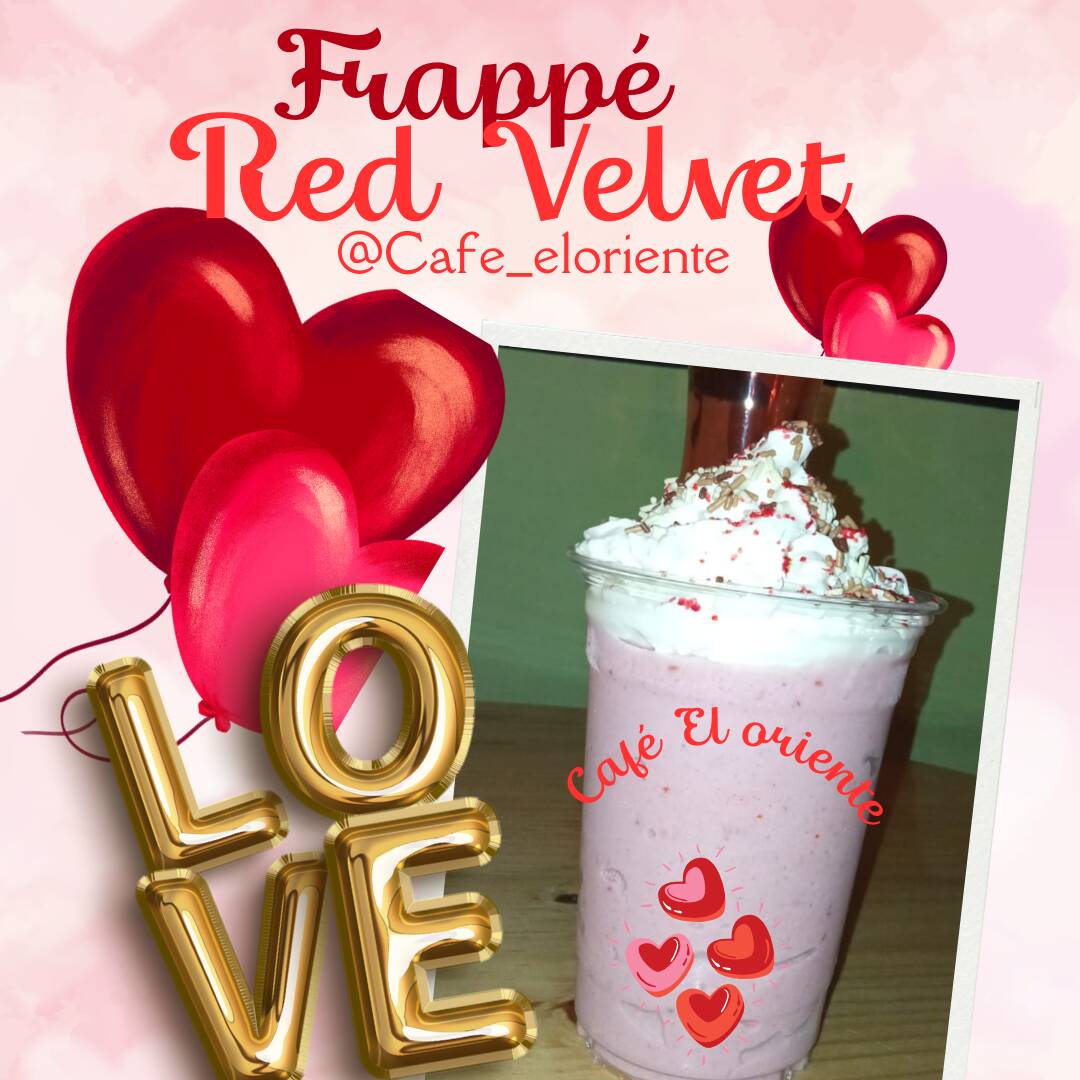 Bebida fria a base de hielos, leche deslactosada, base sabor rec velvet, crema batida, chispas de color rojo.