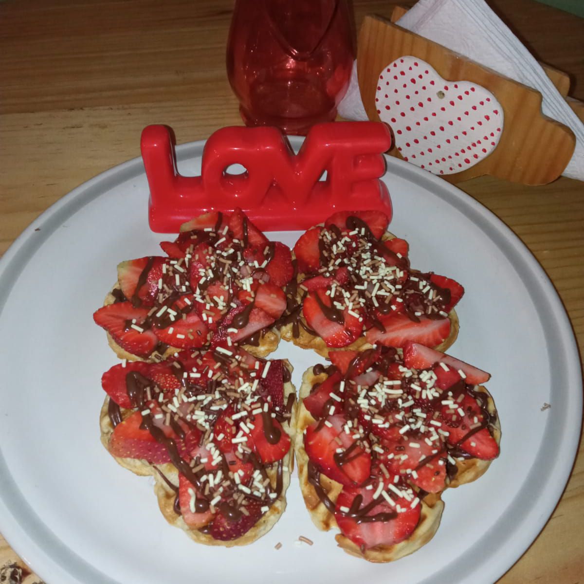 4 mini Waffles dulces en forma de corazón, con una base y una fruta, granillo de nuez.