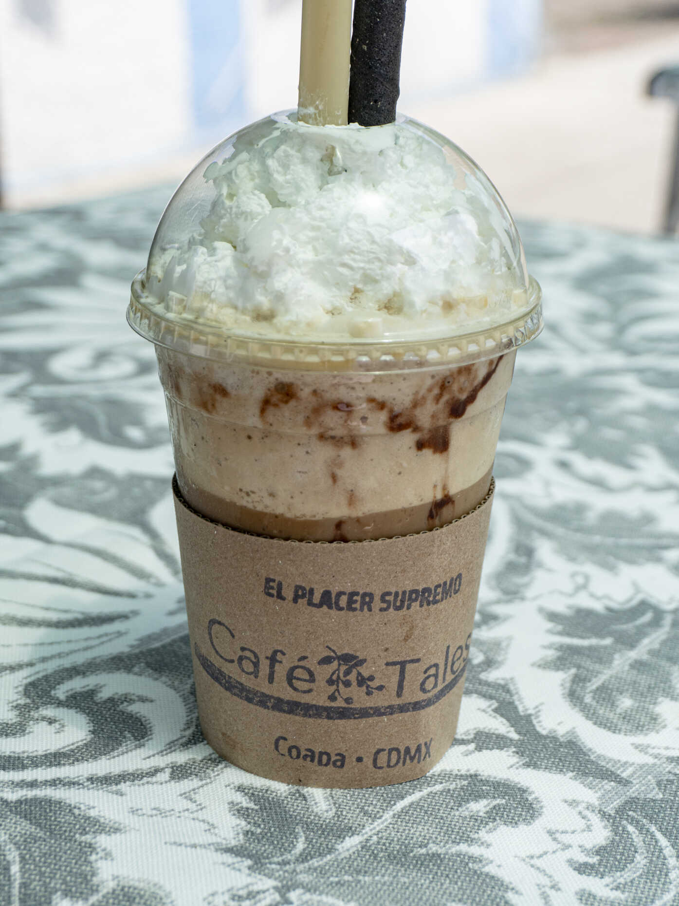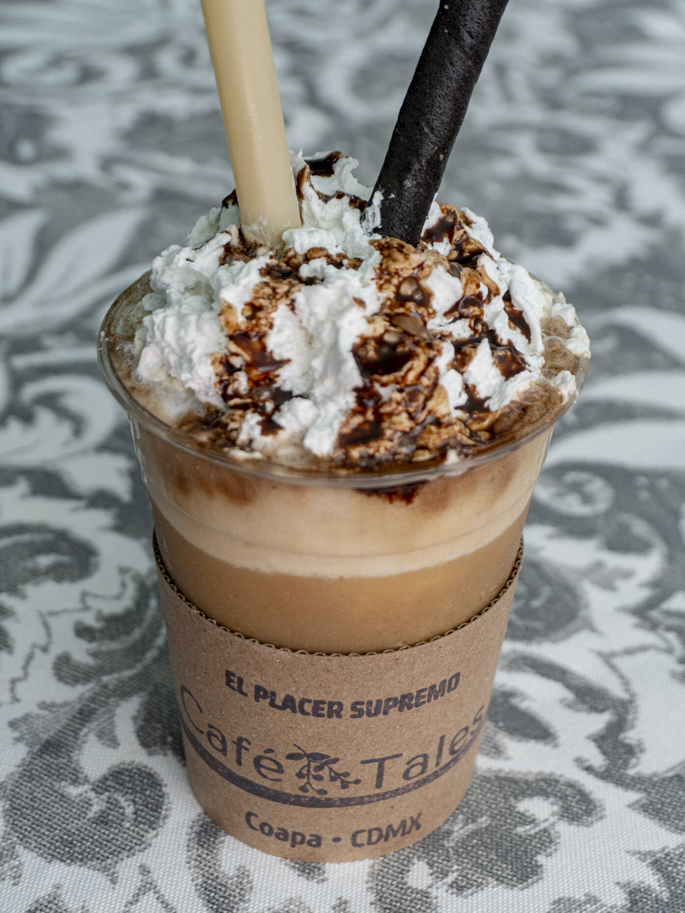 16 onzas de bebida helada de café con chocolate. Se sirve con crema batida, granillo de chocolates y galleta barquillo.