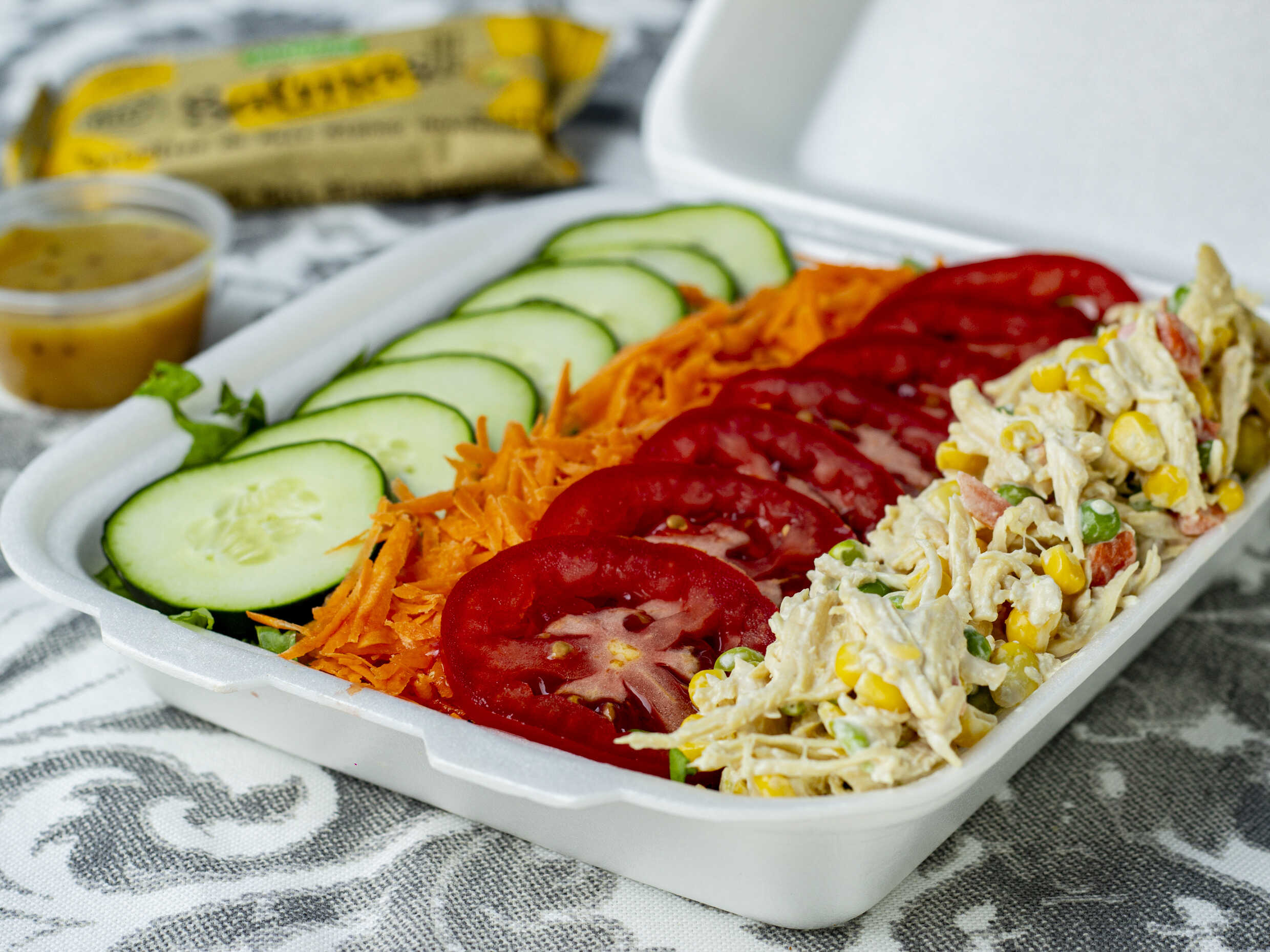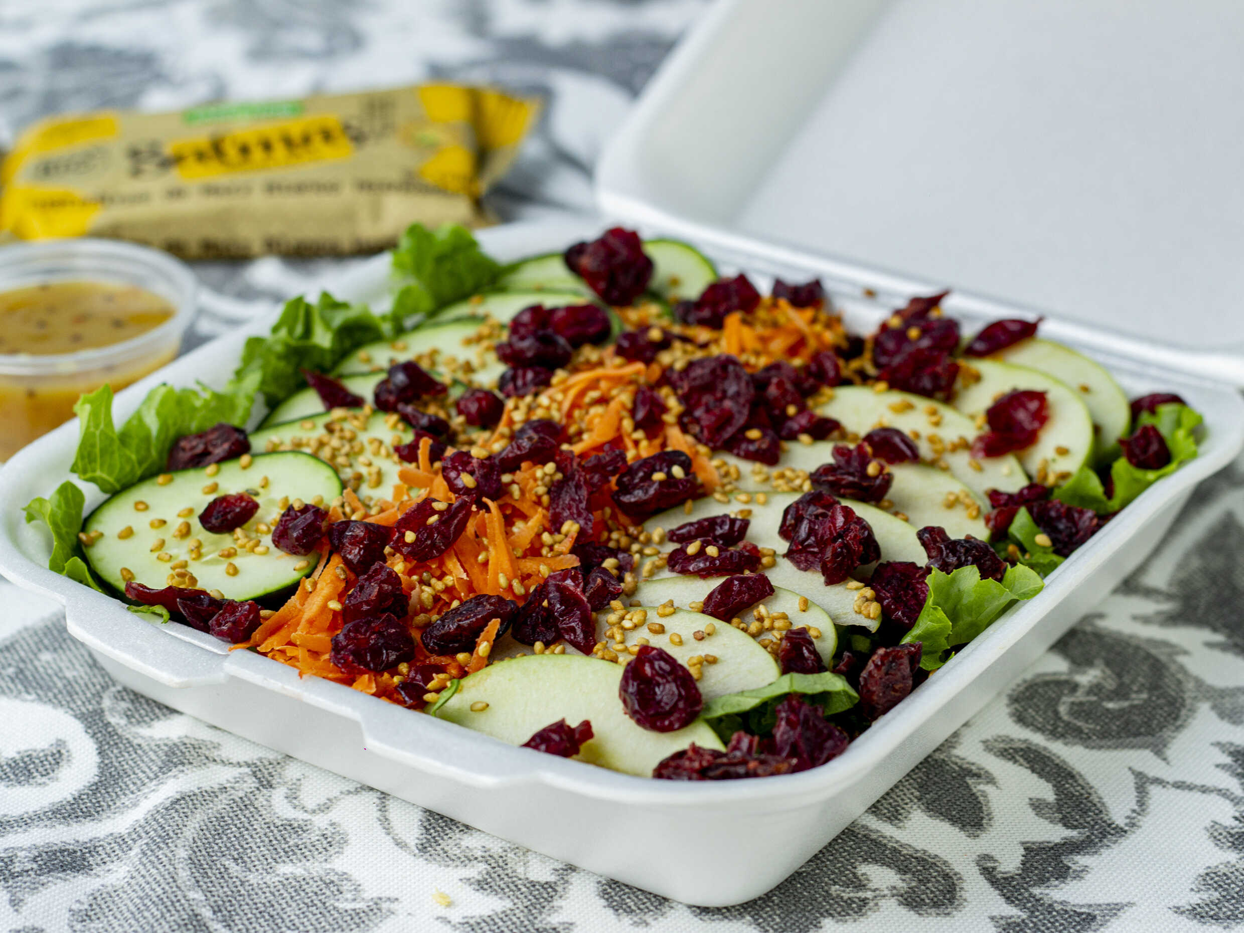 Lechuga, zanahoria, pepino, fruta, arándanos deshidratados, ajonjolí garapiñado, aderezo y tostada, 250 g.