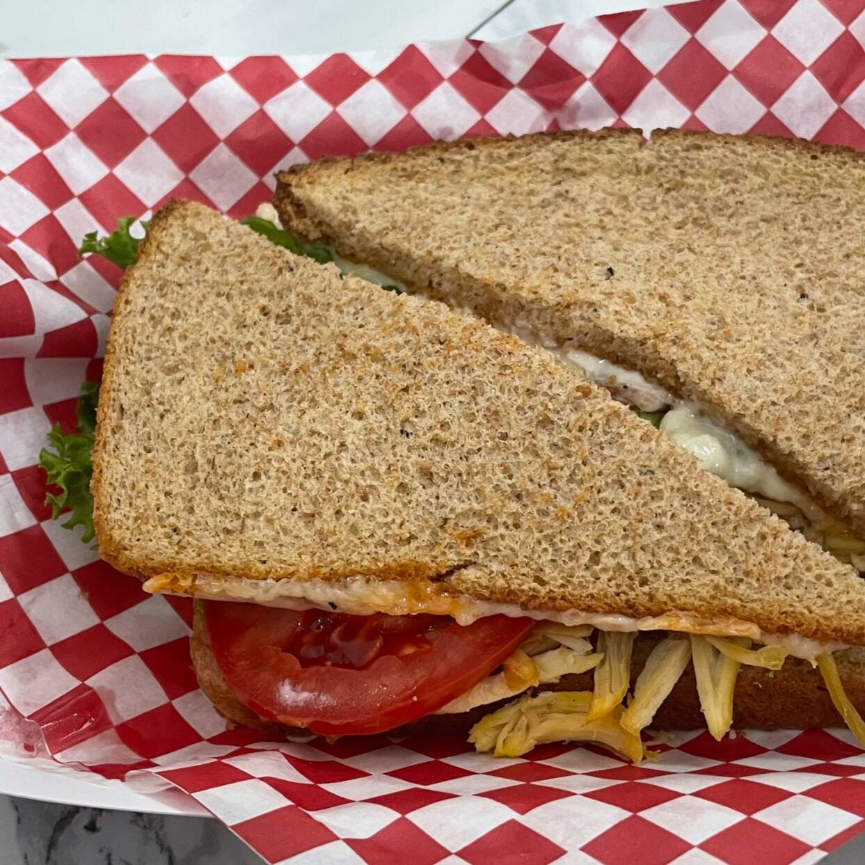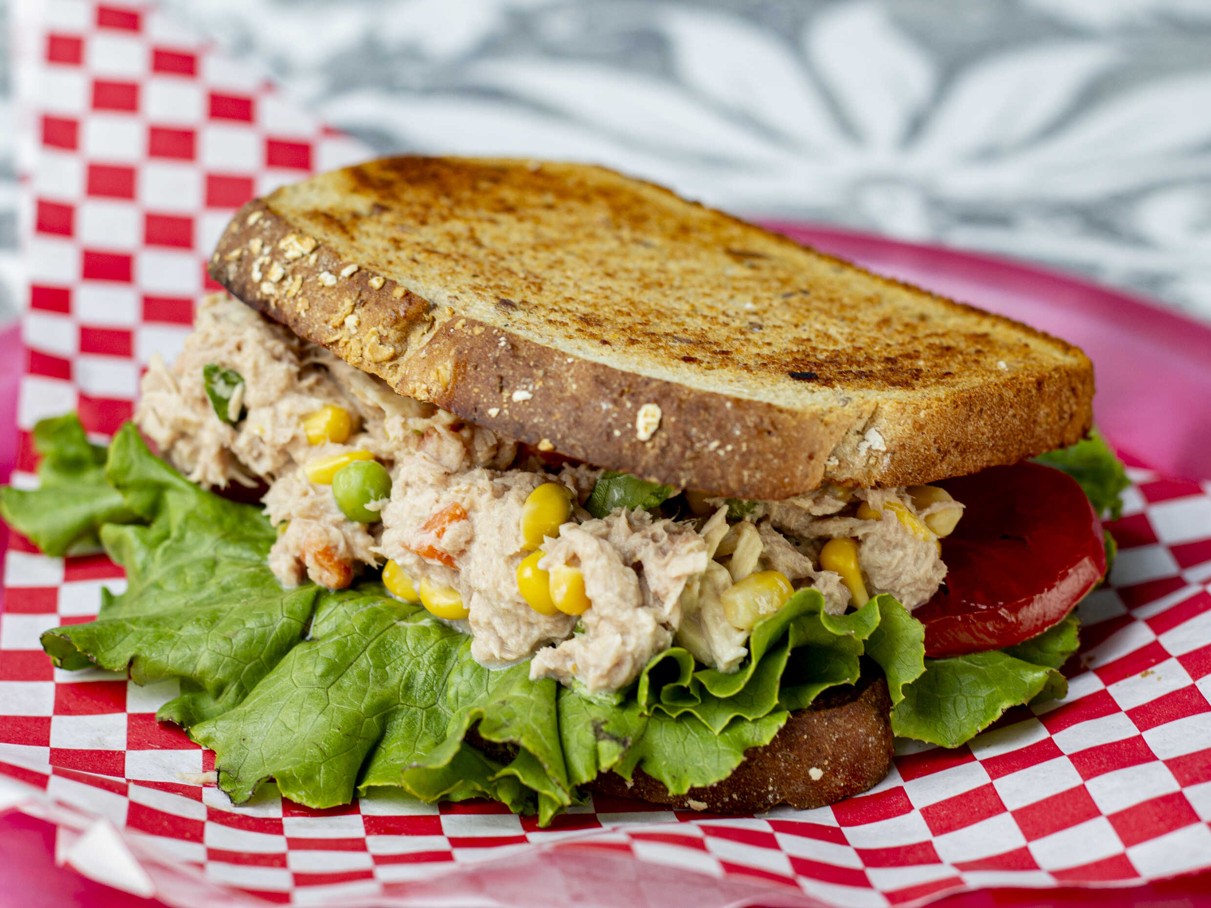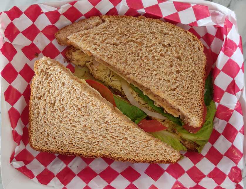 90 gramos de atún en agua mezclado con ensalada campesina (zanahoria, elote y chicharo) y mayonesa. Todos los sandwiches se sirven con cama de lechuga y jitomate.