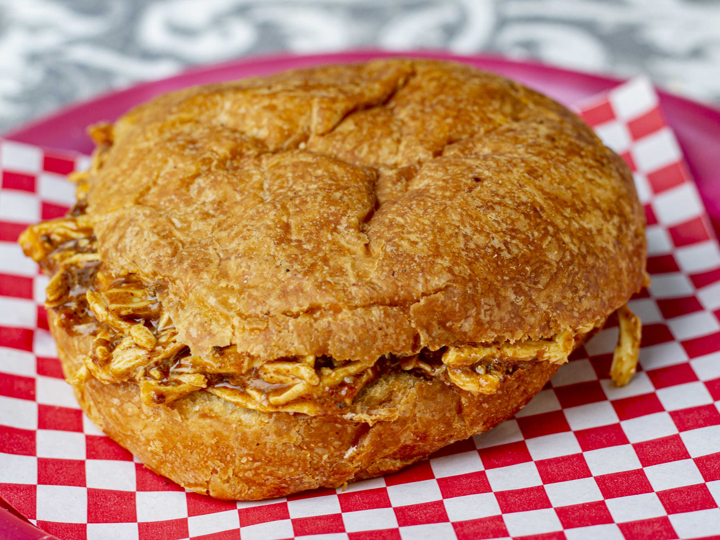 Pan de hojaldra rellena de pollo con mole