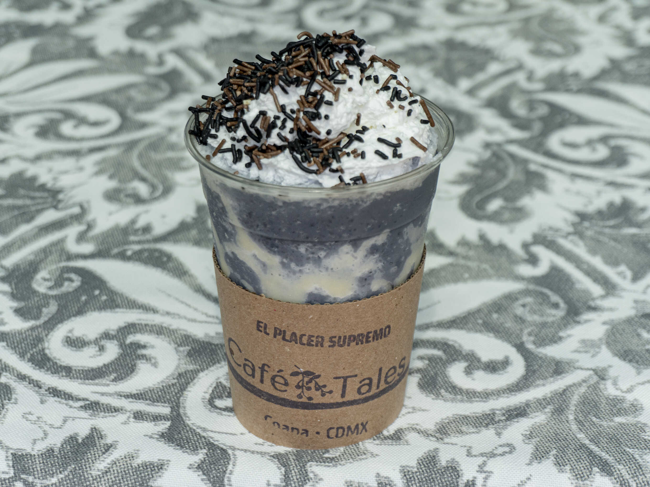 16 onzas de bebida helada sabor Taro. Se sirve con crema batida, chispas de chocolate y galleta barquillo.