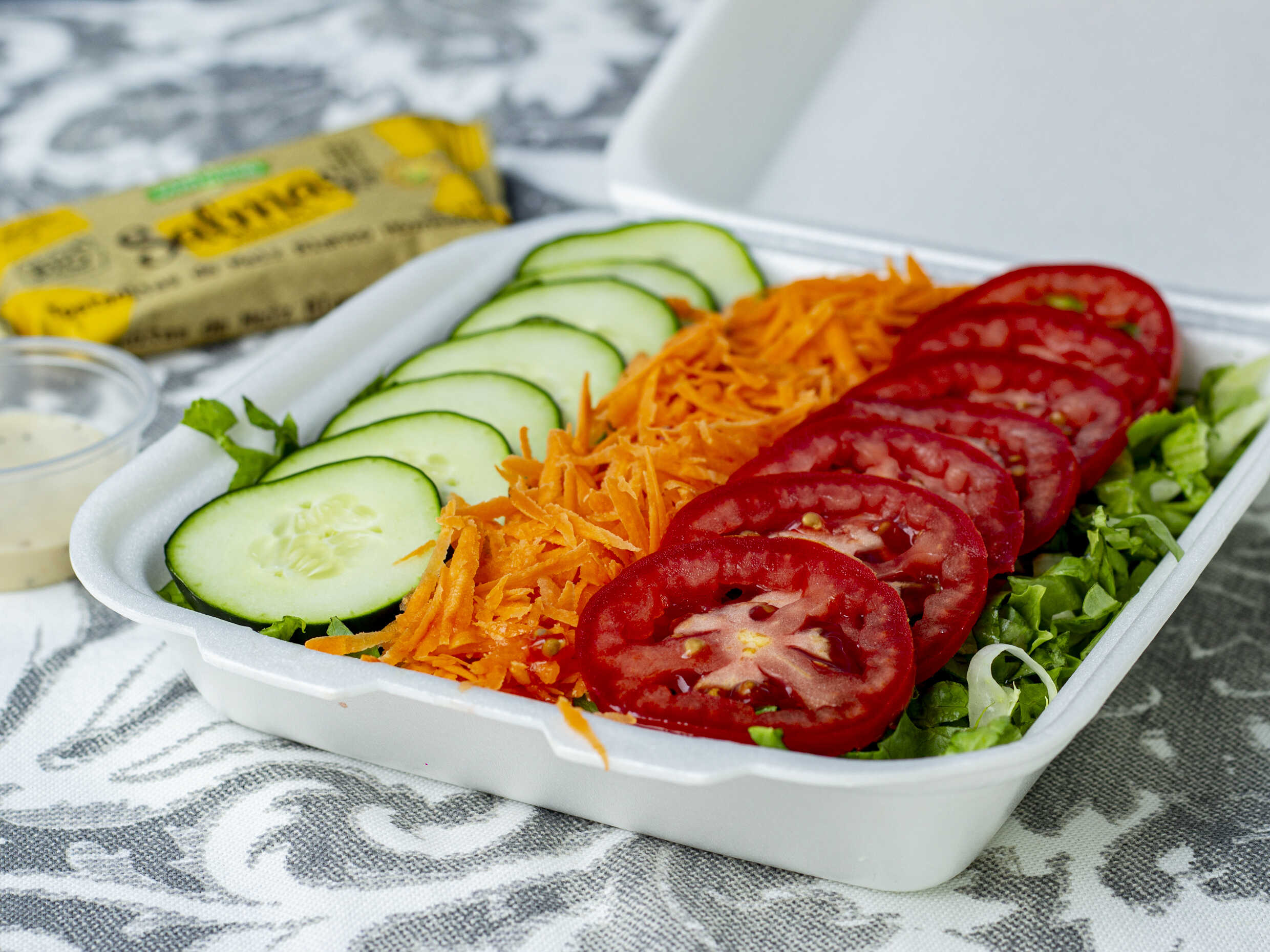 Lechuga, zanahoria, pepino, jitomate, aderezo y tostada, 300 g.