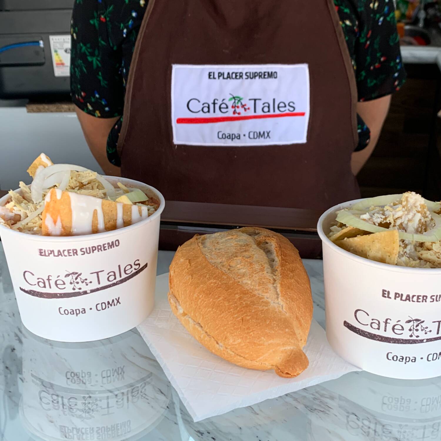 16 onzas de bebida helada, mezcla de café con leche. Se sirve con crema batida, granillo de chocolate y galleta barquillo.