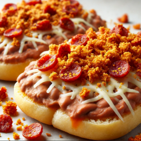 Una pieza de bolillo partida por la mitad contiene frijoles y queso manchego gratinado.