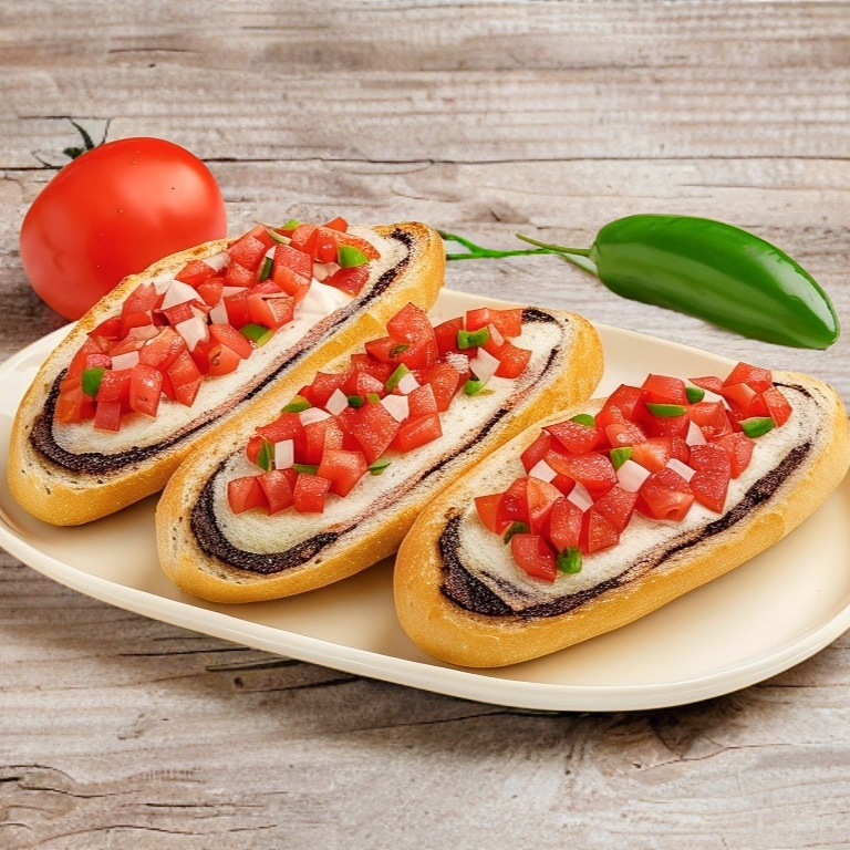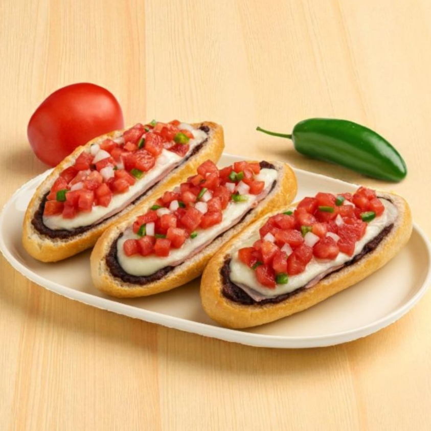 Combinación perfecta de frijoles suaves, jamón, queso derretido y pico de gallo fresco en nuestros deliciosos molletes.