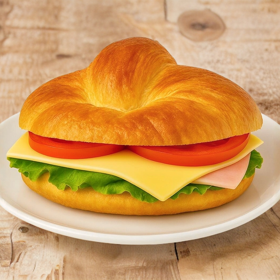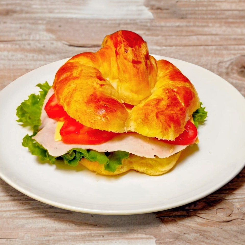 Cuernito relleno de jamón, queso Oaxaca derretido, jitomate, lechuga y queso amarillo.