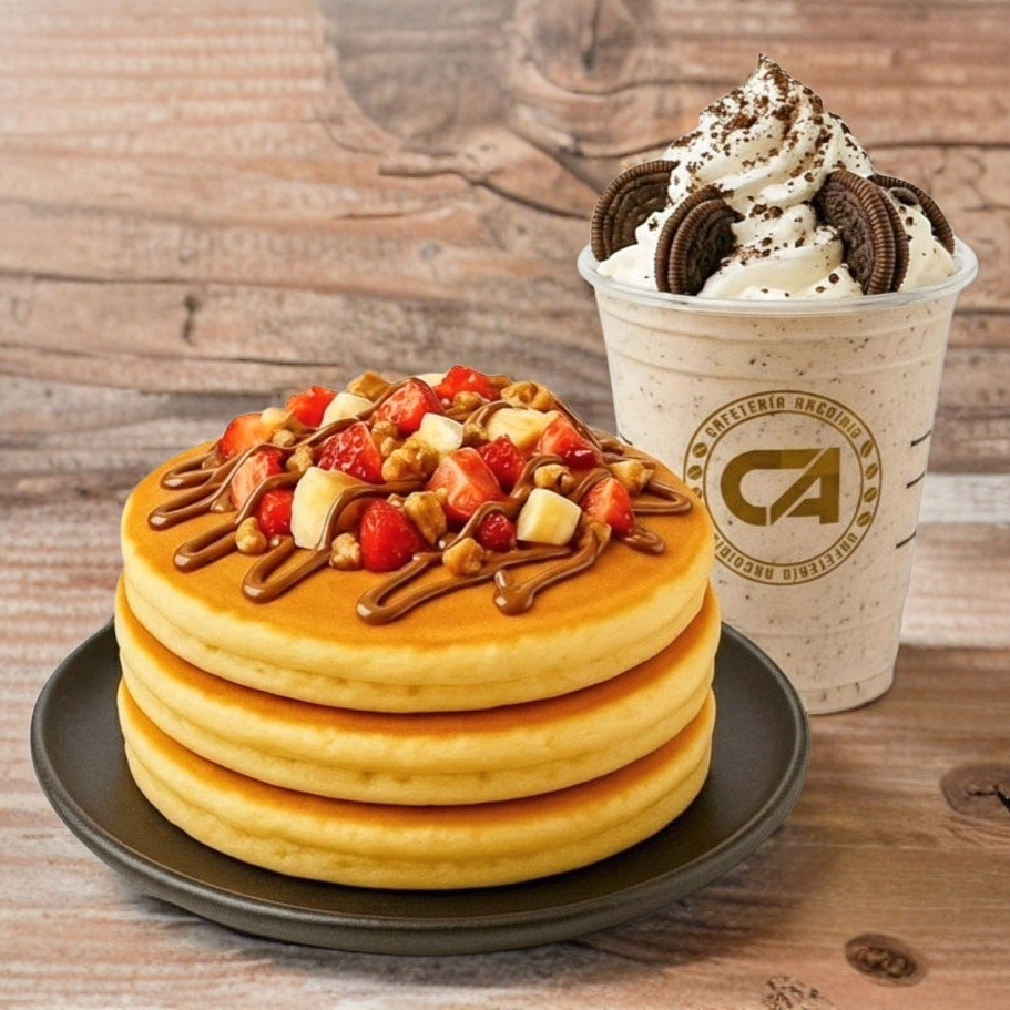 Orden de 3 Hot Cakes & 1 Frappe de 16 Oz, sabor a elegir (Todos nuestros frappes están elaborados con leche Santa Clara Deslactosada)