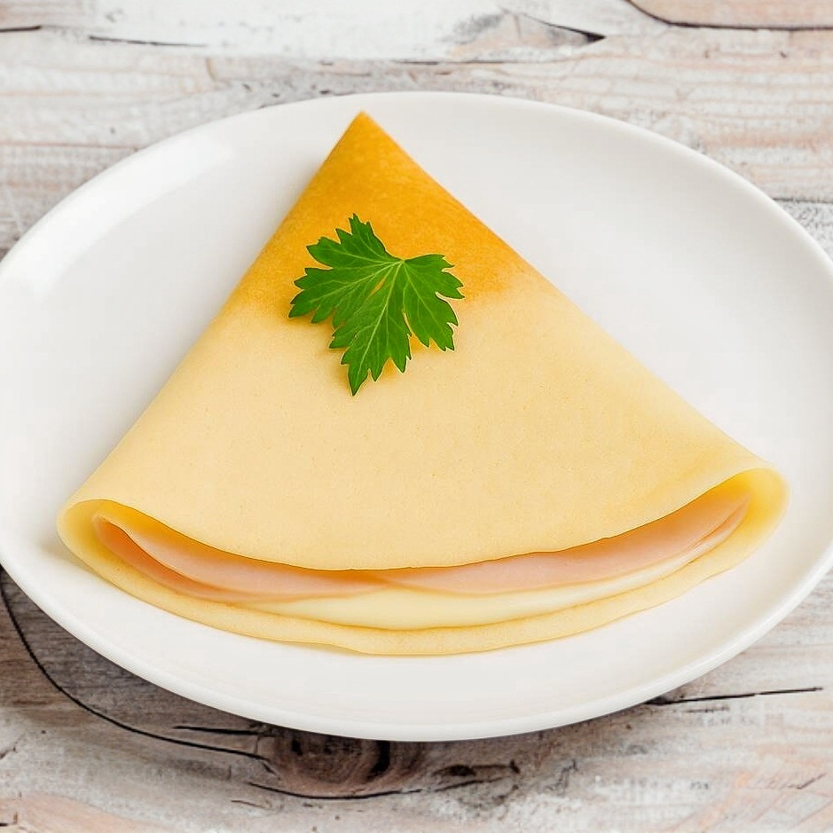 Crepa de 40cm de diámetro (20cm ya en triangulo) Rellena de queso philadelphia con jamón de pavo.
