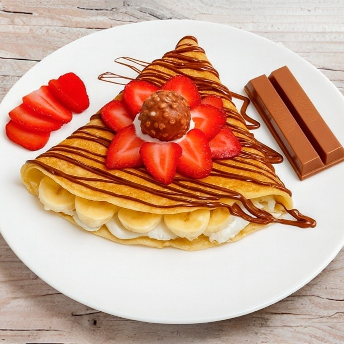 Crepa de 40cm de diámetro (20cm ya en triangulo) Rellena de nutella, fresa, plátano y queso philadelphia, decorada con un ferrero encima. (Toppings adicionales con costo extra)