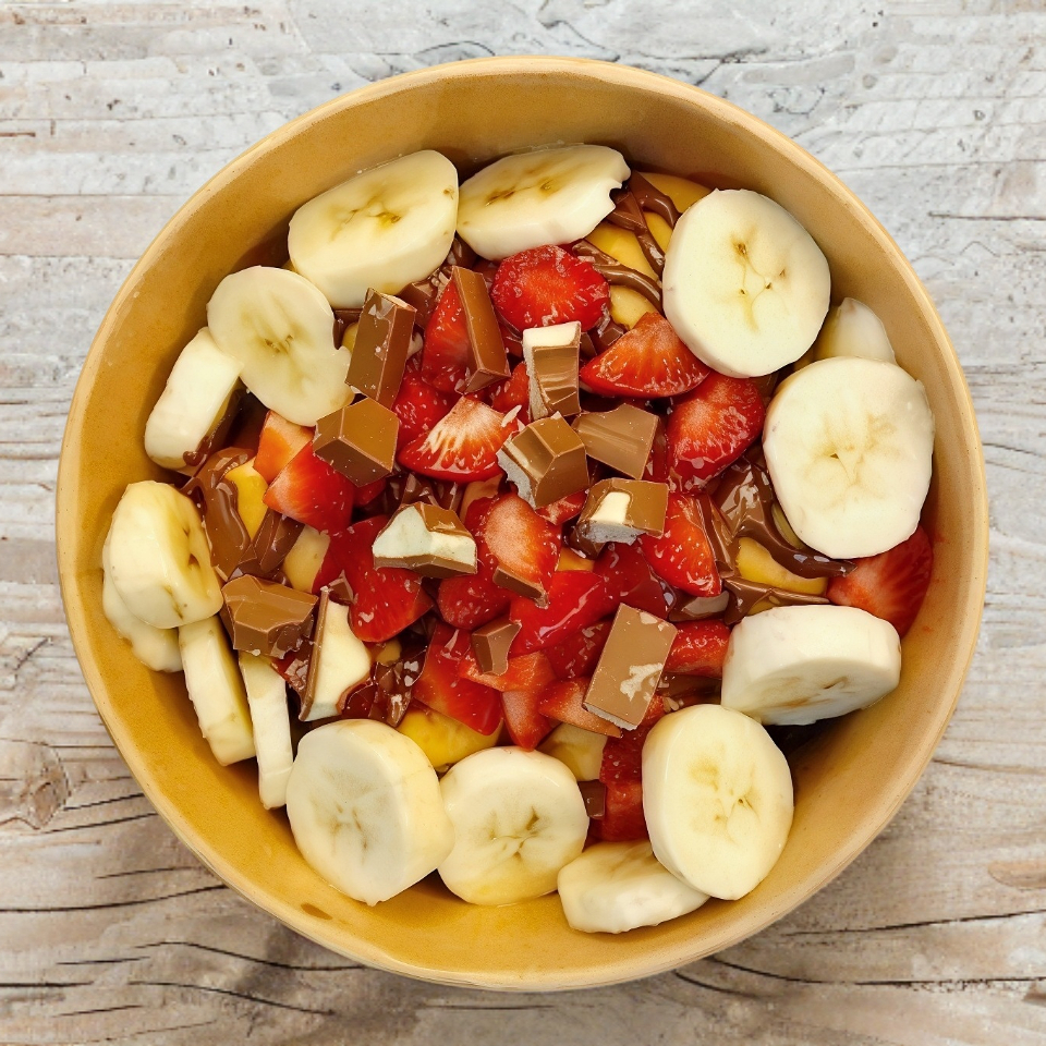 Comida/Snack a elegir + Fruta Picada (Fresa y Plátano) + Dulce + Jugo