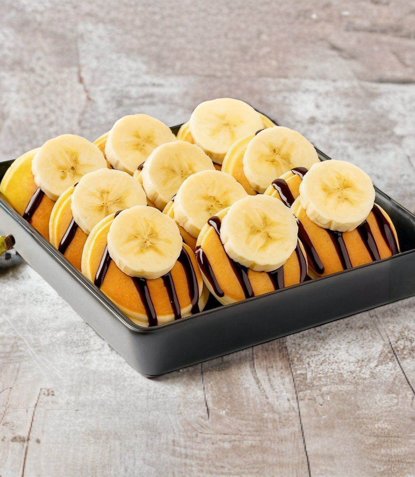Delicioso hotcake suave y esponjoso, doblado al estilo taco, relleno con plátano fresco y cubierto con una generosa capa de Nutella.