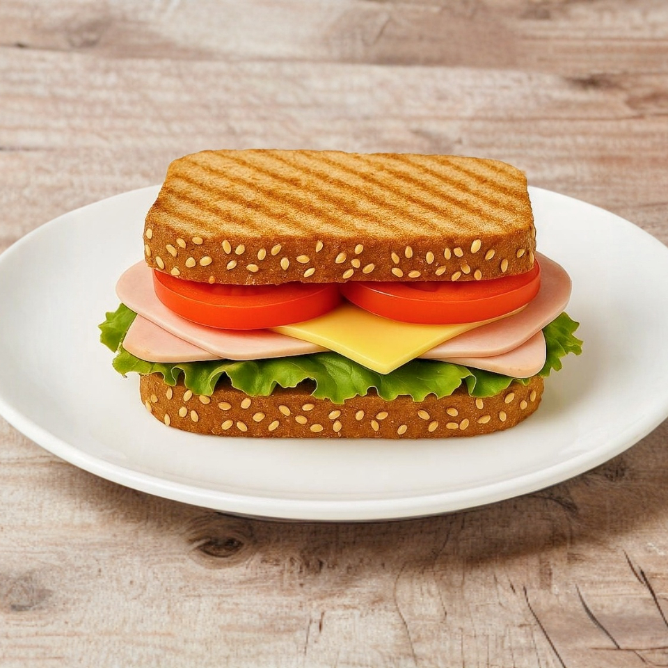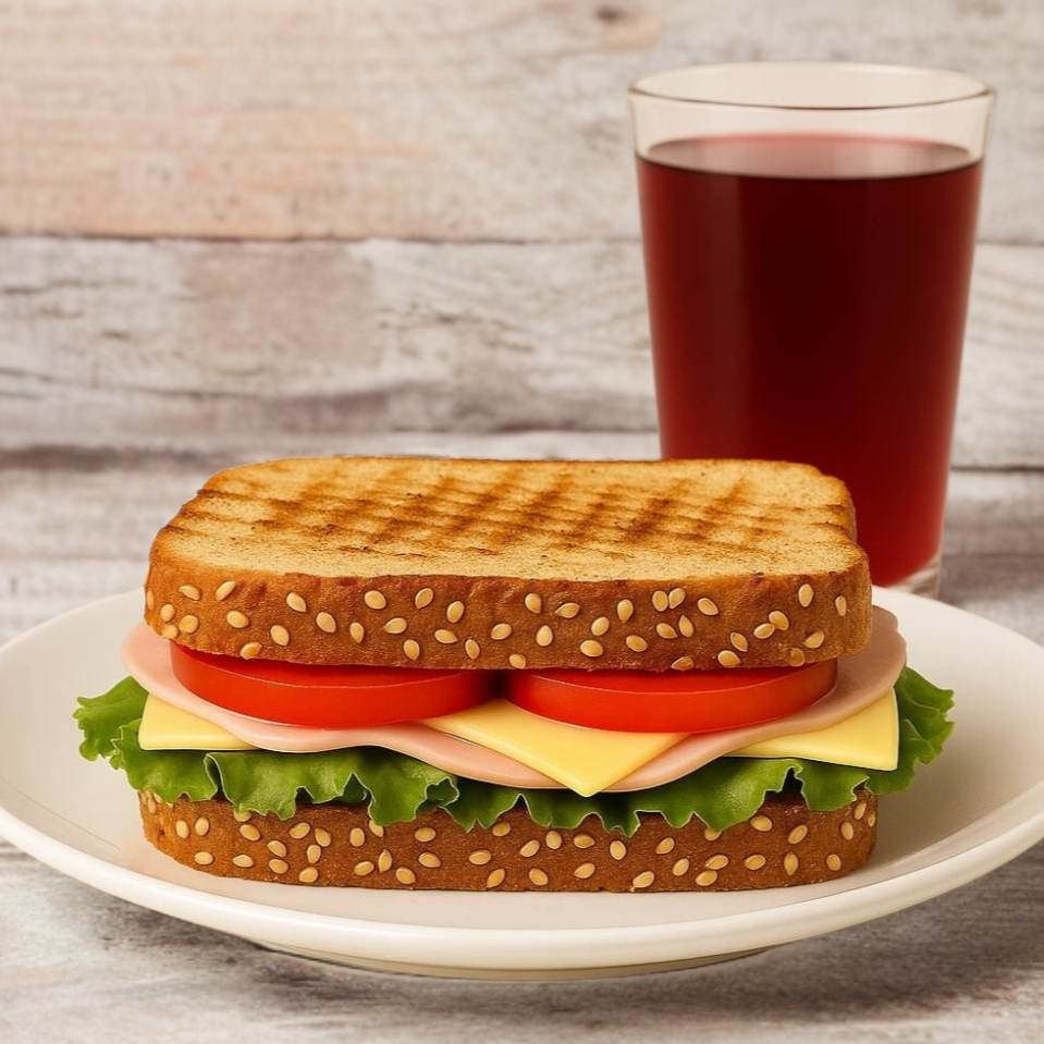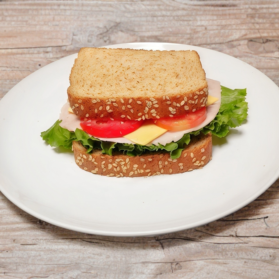 Sándwich de pan integral relleno de ingredientes frescos y sabrosos (jamón, jitomate, lechuga y queso amarillo).