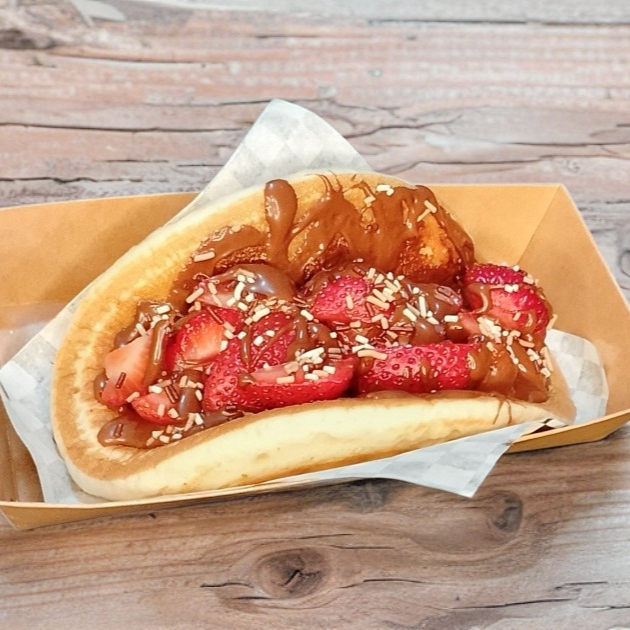 Hotcake suave y esponjoso, doblado como taco, relleno con fresas frescas y bañado con una irresistible capa de Nutella.