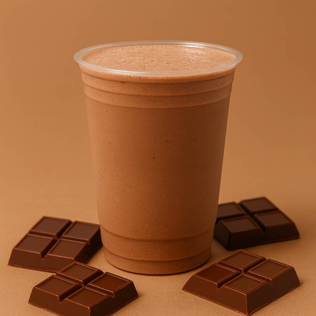 Licuado de chocolate, plátano y leche, cremoso, con el rico sabor del chocolate y la dulzura natural del plátano.
