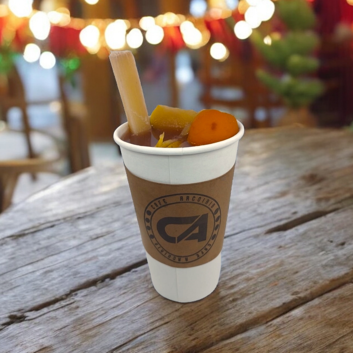 Exquisito ponche caliente con tejocote, caña, guayaba, manzana, ciruela pasa, canela, piloncillo y un toque de jamaica.
