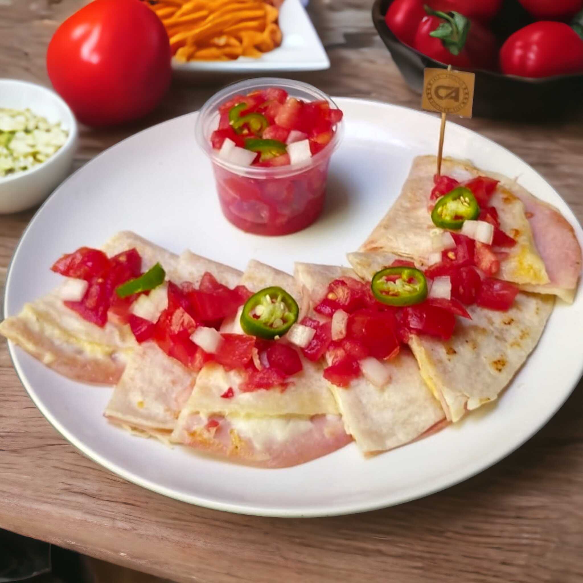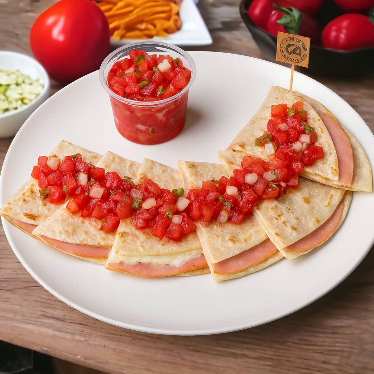 Nuestras sincronizadas son el antojito perfecto para compartir. Tortillas de harina rellenas de queso y jamón, gratinadas y servidas con pico de gallo.