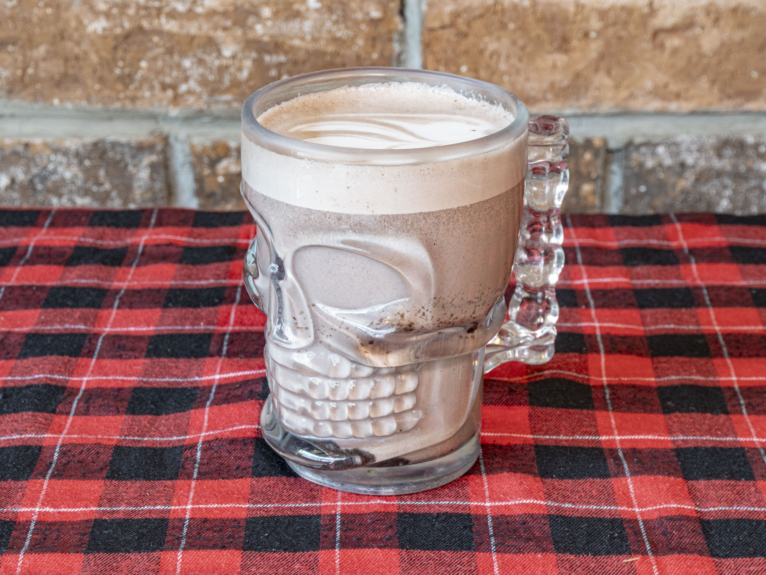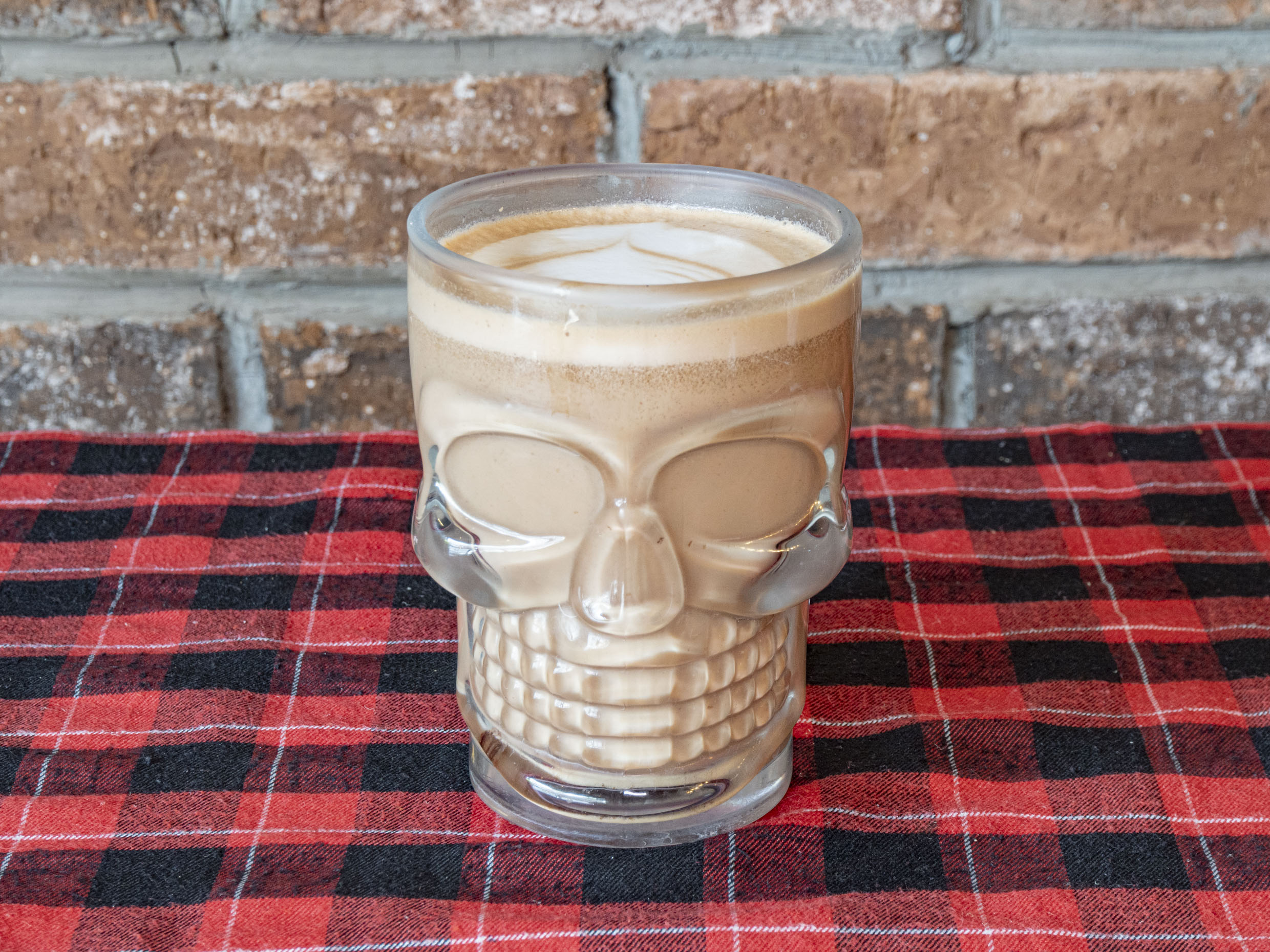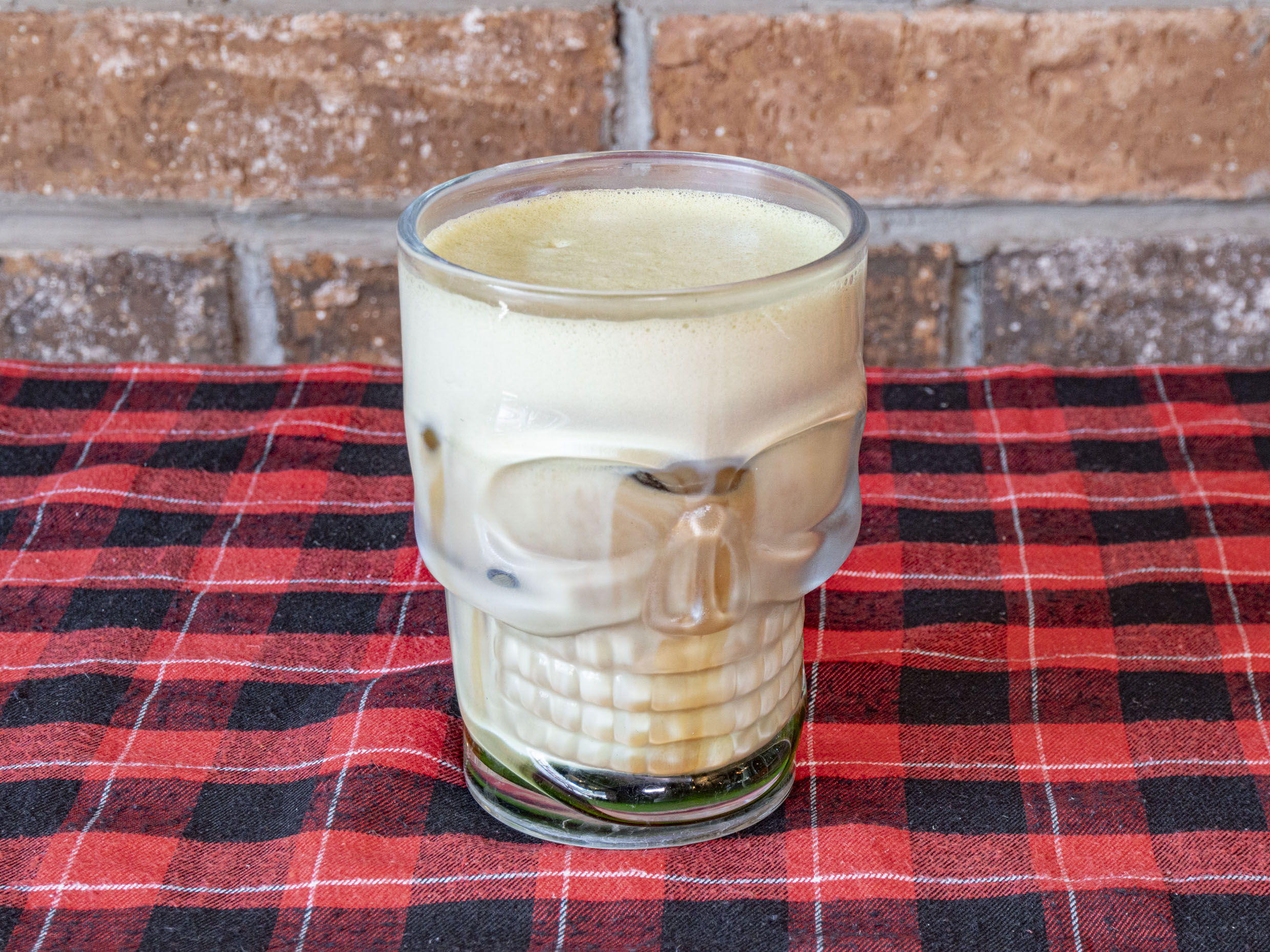 Base de hielo, leche espumado con horchata con horchata, maracuyá y cold brew.