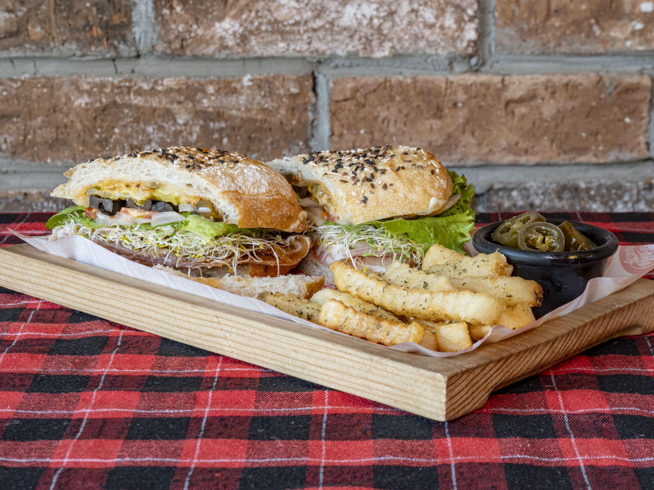 Sándwich de 3 pisos con pan tostado relleno de pollo, queso americano, queso gouda, jamón de york, tocino, lechuga, jitomate, aderezo y cebolla acompañada con papas fritas onduladas.