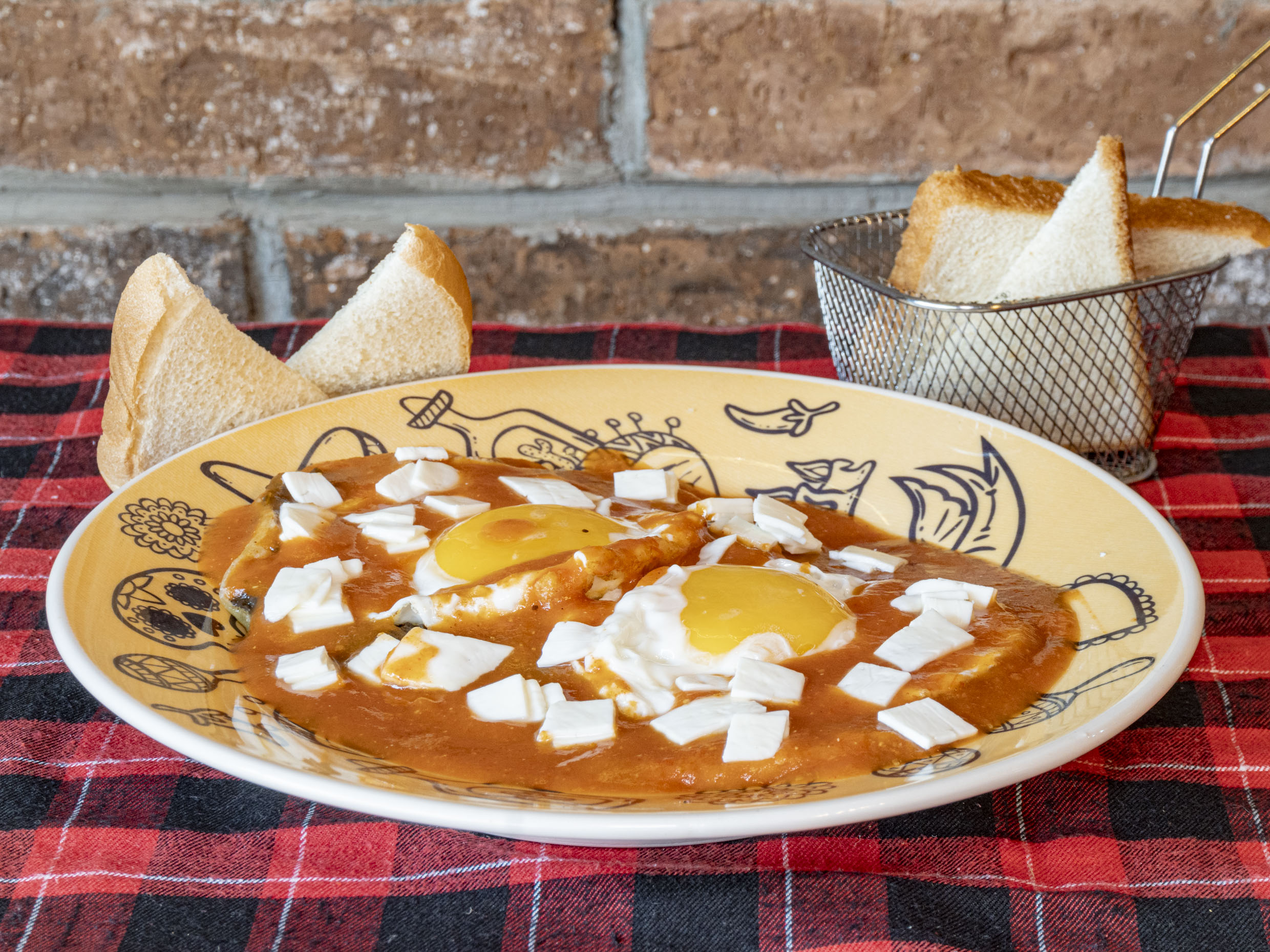 Totopos de tortilla azul, servidos con una deliciosa salsa morita o verde, queso panela, crema, cebolla y cilantro acompañados con frijoles refritos y pan.