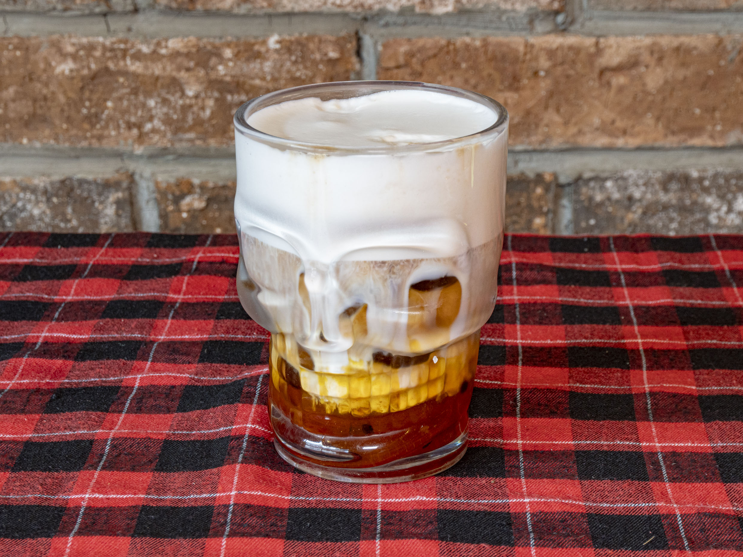 Base de hielo, leche espumada con jarabe de plátano y cold brew.