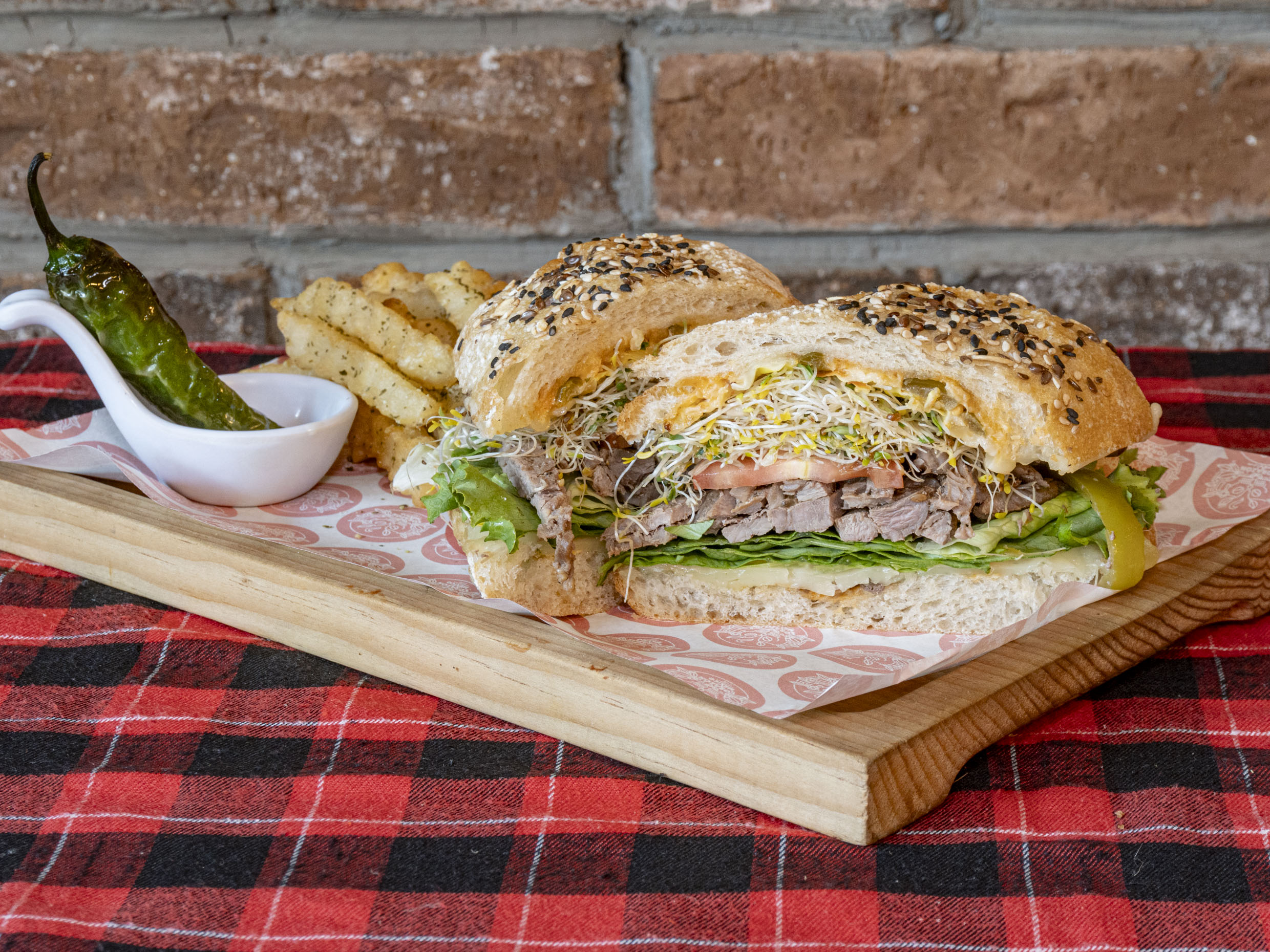 Jugosa arrachera de res 150 gr, cebolla asada, queso gouda, pimiento morrón, lechuga, germen de trigo y aderezo de chimichurri 320 gr.