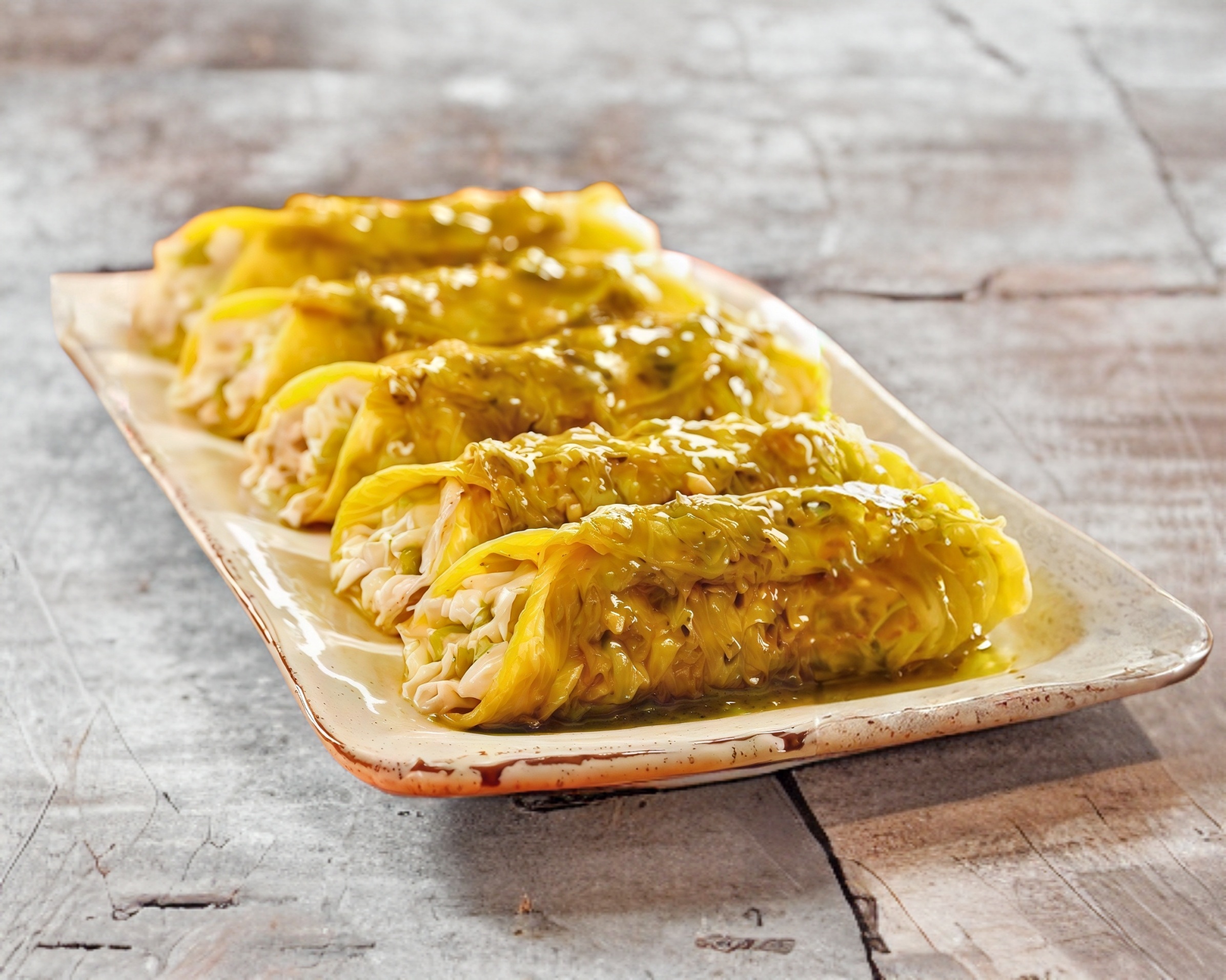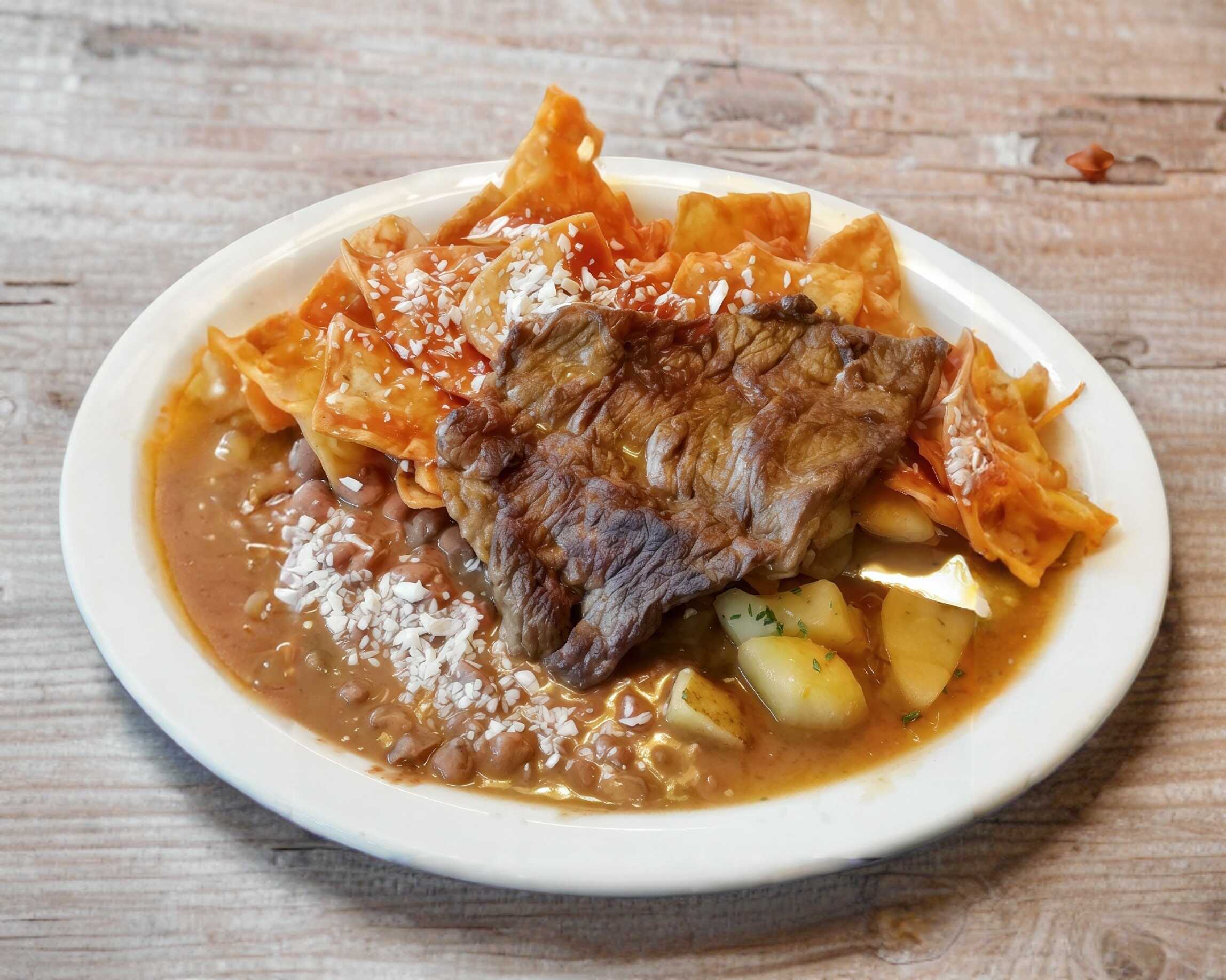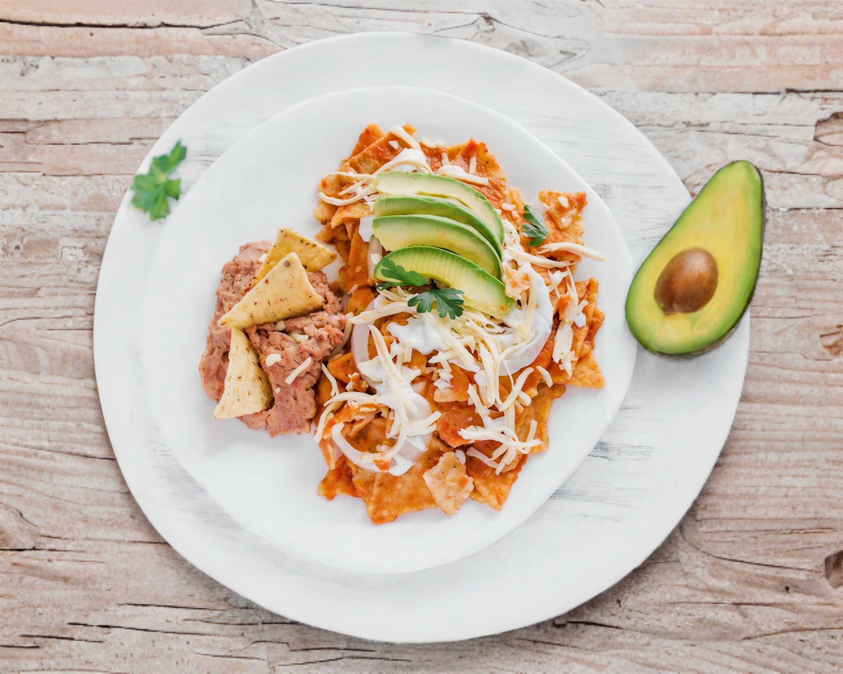 Platillo para una persona, el cual incluye: Chilaquiles con Pollo (130 gramos aprox), Frijoles Refritos, 1 Bolillo, Cebolla, bañados con Salsa Verde.
