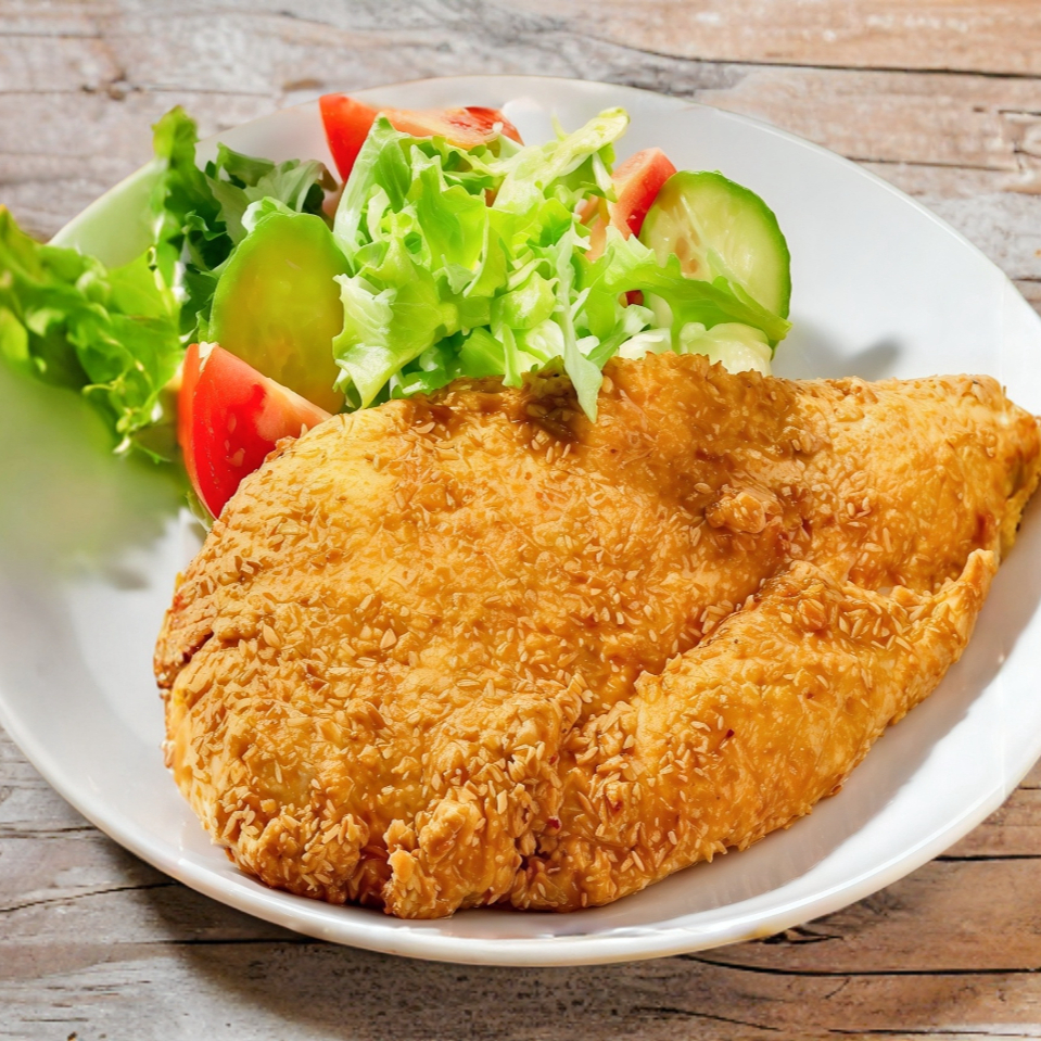 Milanesa de res empanizada con jamon y parmesano salsa de tomate, con 200 gr de spaguetti al burro.