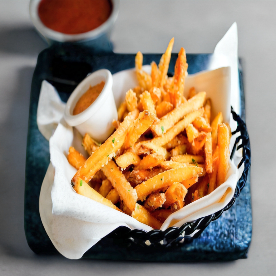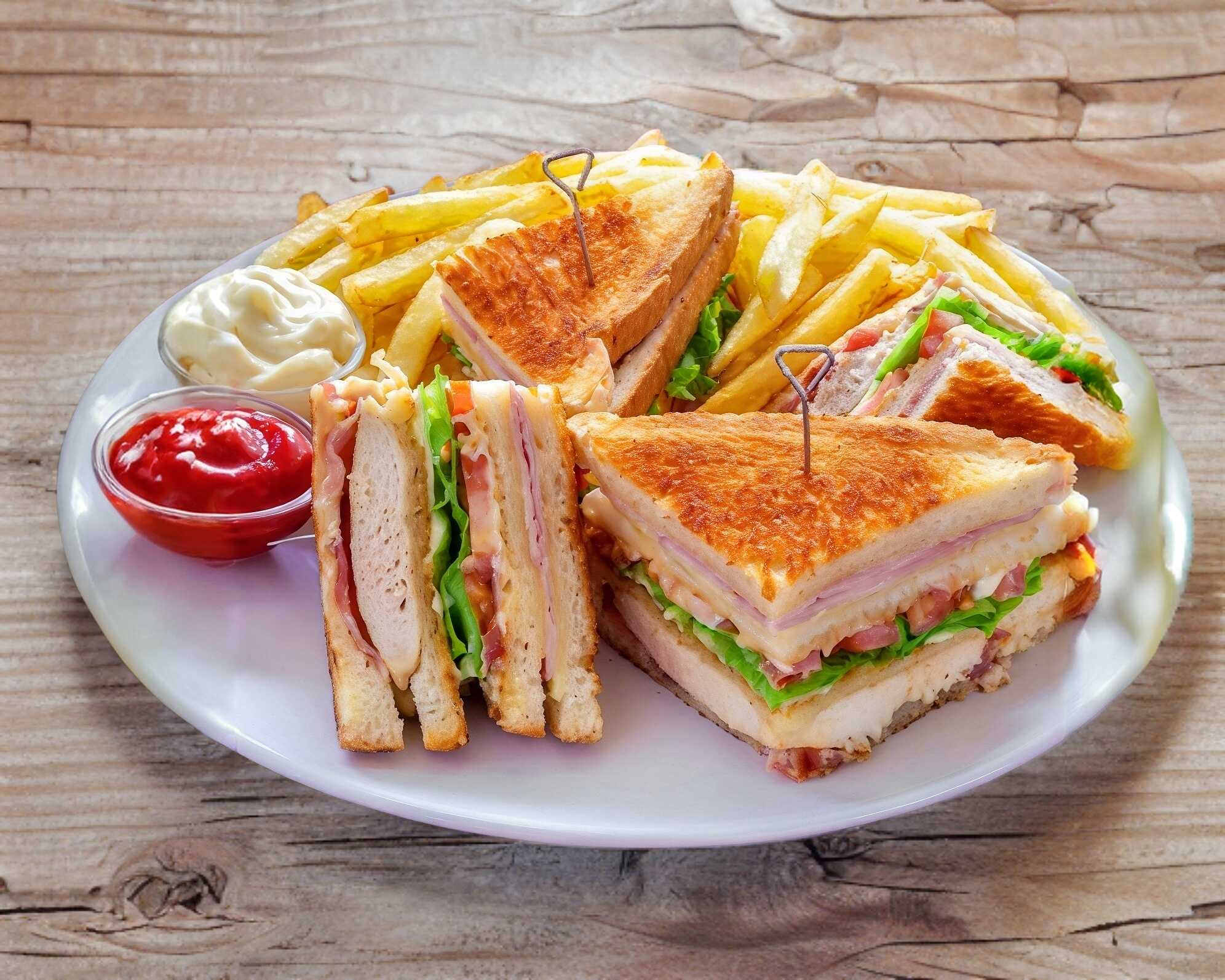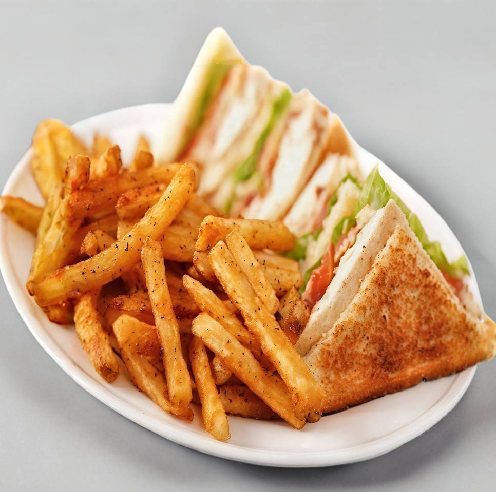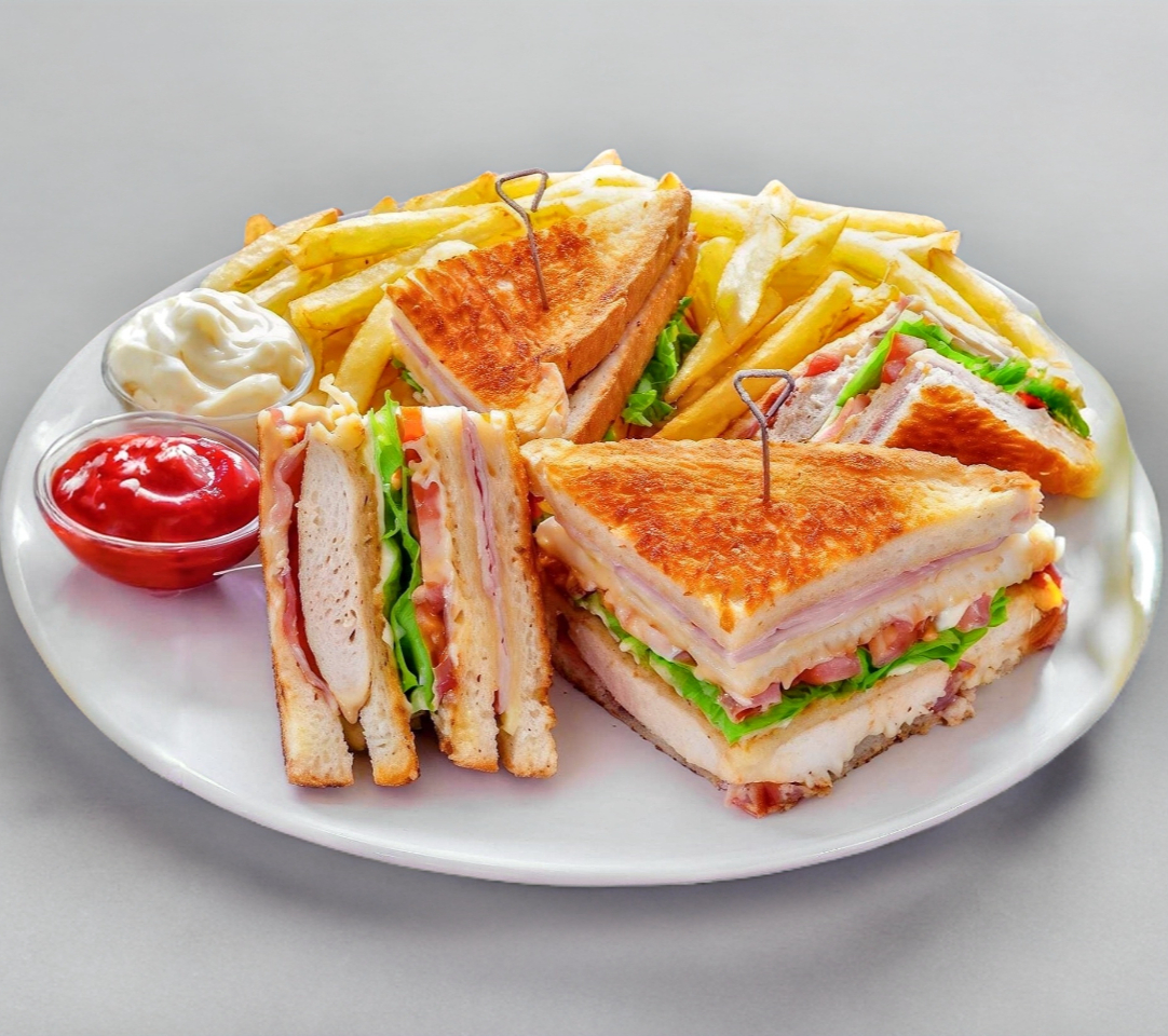 Delicioso club Sándwich de 3 pz de pan con Pollo Deshebrado Lleva Jitomate Cebolla Lechuga y Rajas Acompañado de Papa a la Francesa