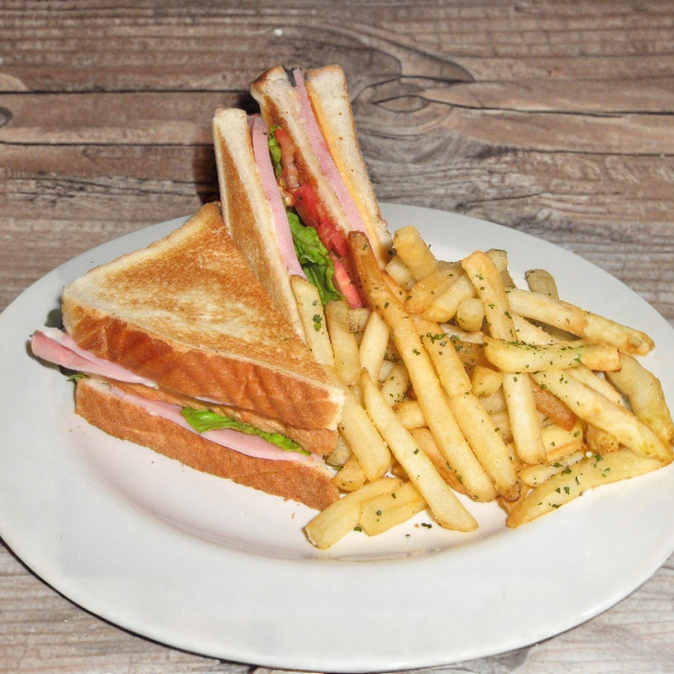 Rico Sándwich de 3 pz con Jamón y Queso Lleva Jitomate y Lechuga y una Porción de Papas