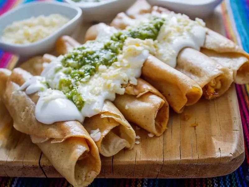 Destaca por su cremosidad y su delicioso sabor. Se preparan con tortillas de maíz suaves que se rellenan de pollo desmenuzado