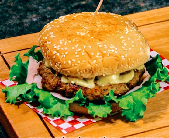 deliciosa carne de res de 180g, tocino, manchego, cebolla caramelizada y verdura.