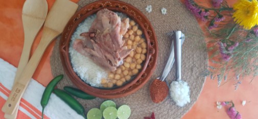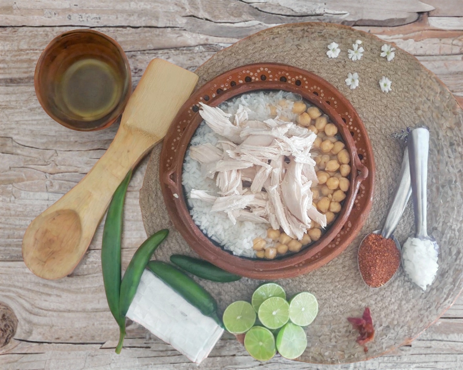Orden de caldo de gallina acompañado con arroz, garbanzo, salsa y limones.