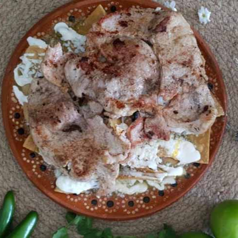 Orden de Chilaquiles Verdes Con Bistec Bañados con Salsa Verde Acompañados de Crema y Queso Rayado.