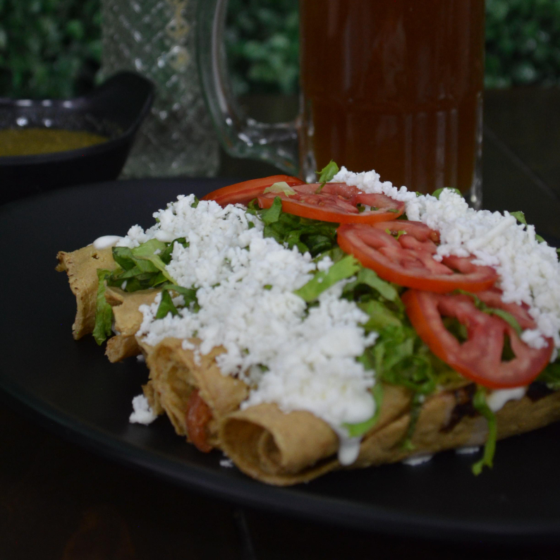 Orden de 5 Tacos Dorados rellenos de Gallina Desmenuzada Acompañados con Crema, queso, lechuga, jitomate y salsa.