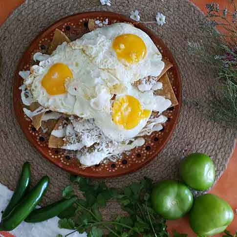 Orden de Chilaquiles Bañados en Salsa Verde Acompañados con 2 Huevos Estrellados Volteados con Crema y Queso Rayado.