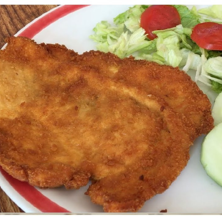 Lamina de pechuga empanizada acompañada de arroz, frijoles, ensalada, tortillas y salsa.