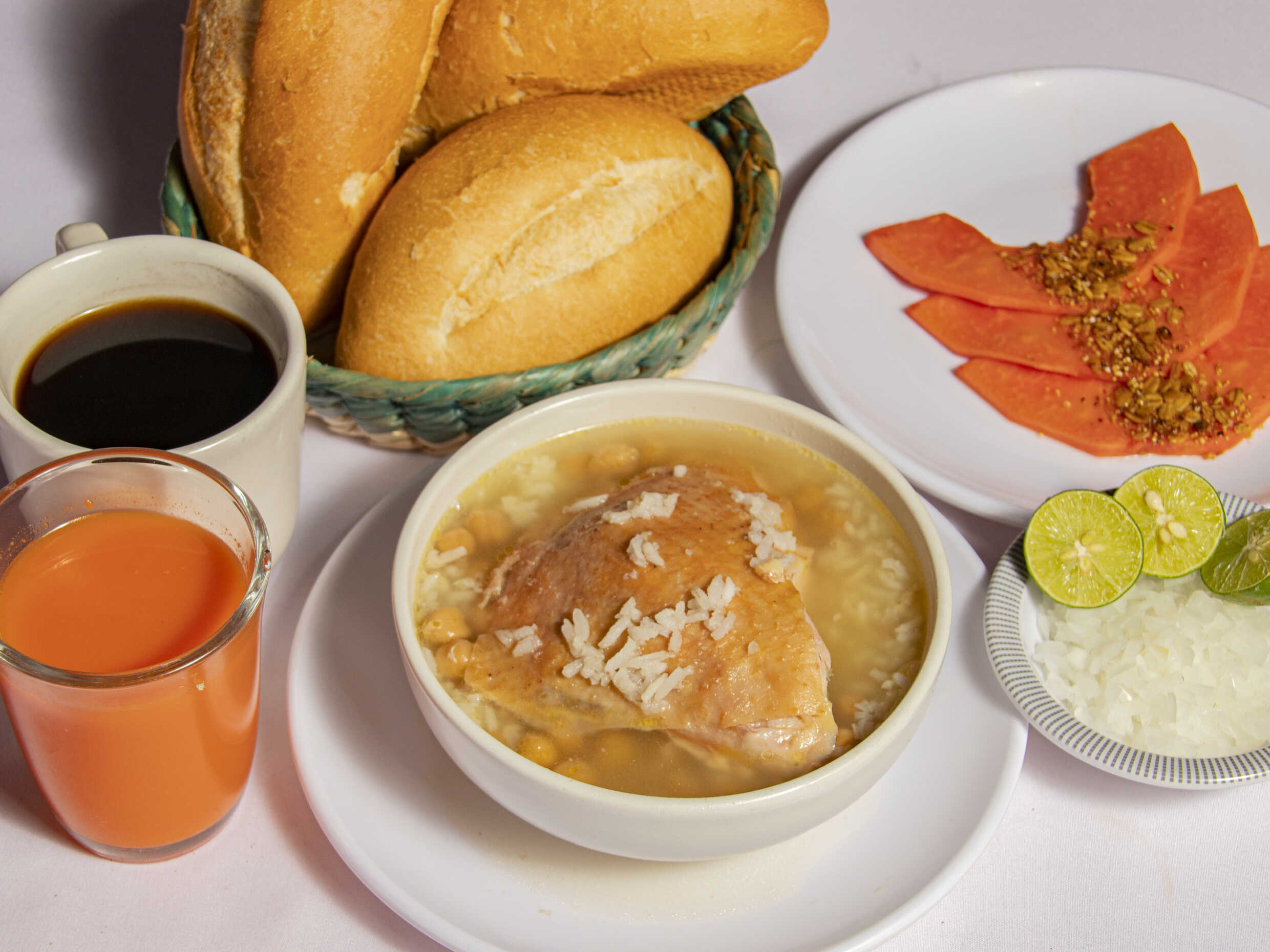 Pieza de gallina en caldo con pan o tortilla acompañado de cafe de olla y jugo o fruta