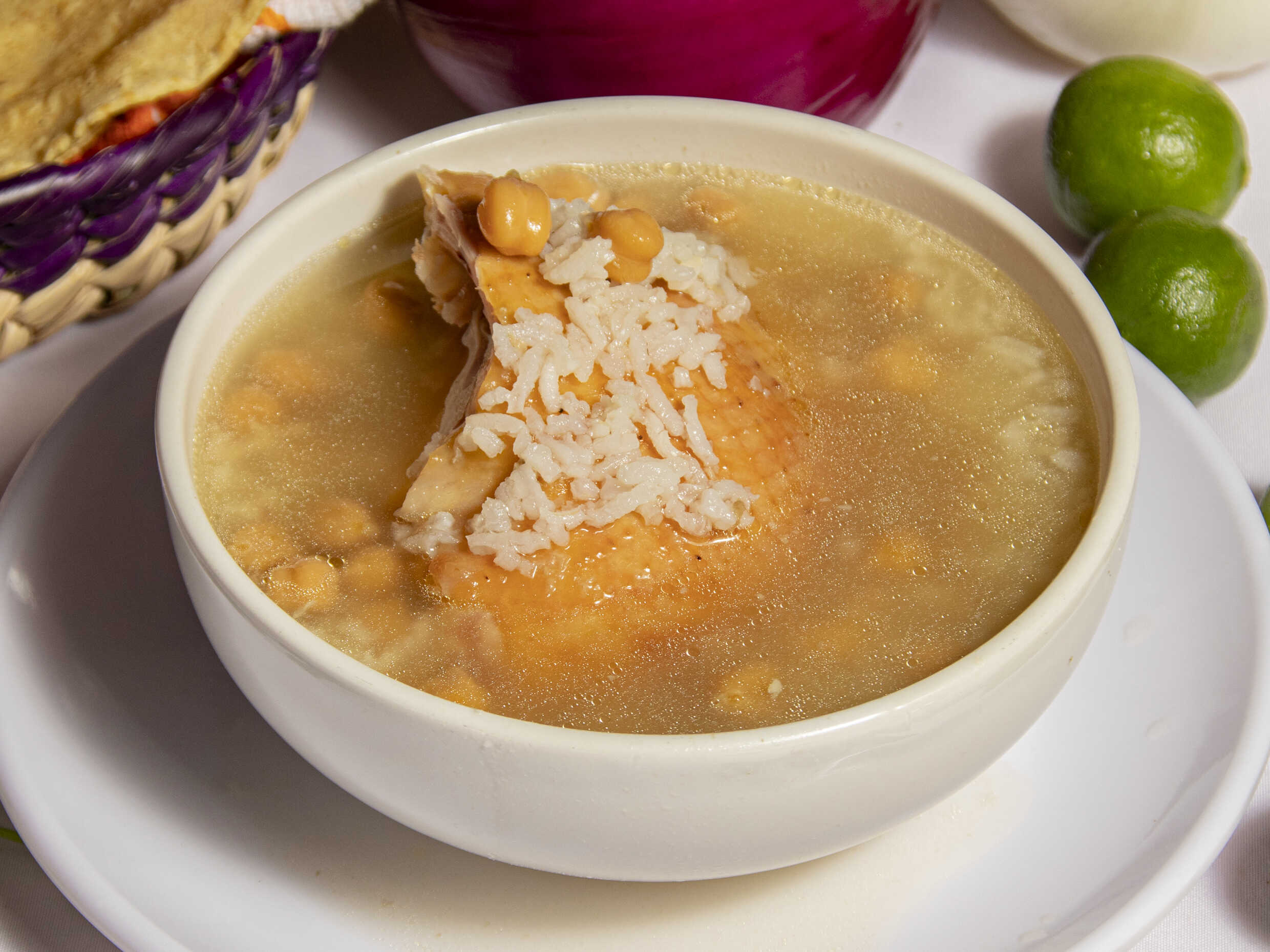 Medio litro de caldo de gallina con arroz y garbanzo