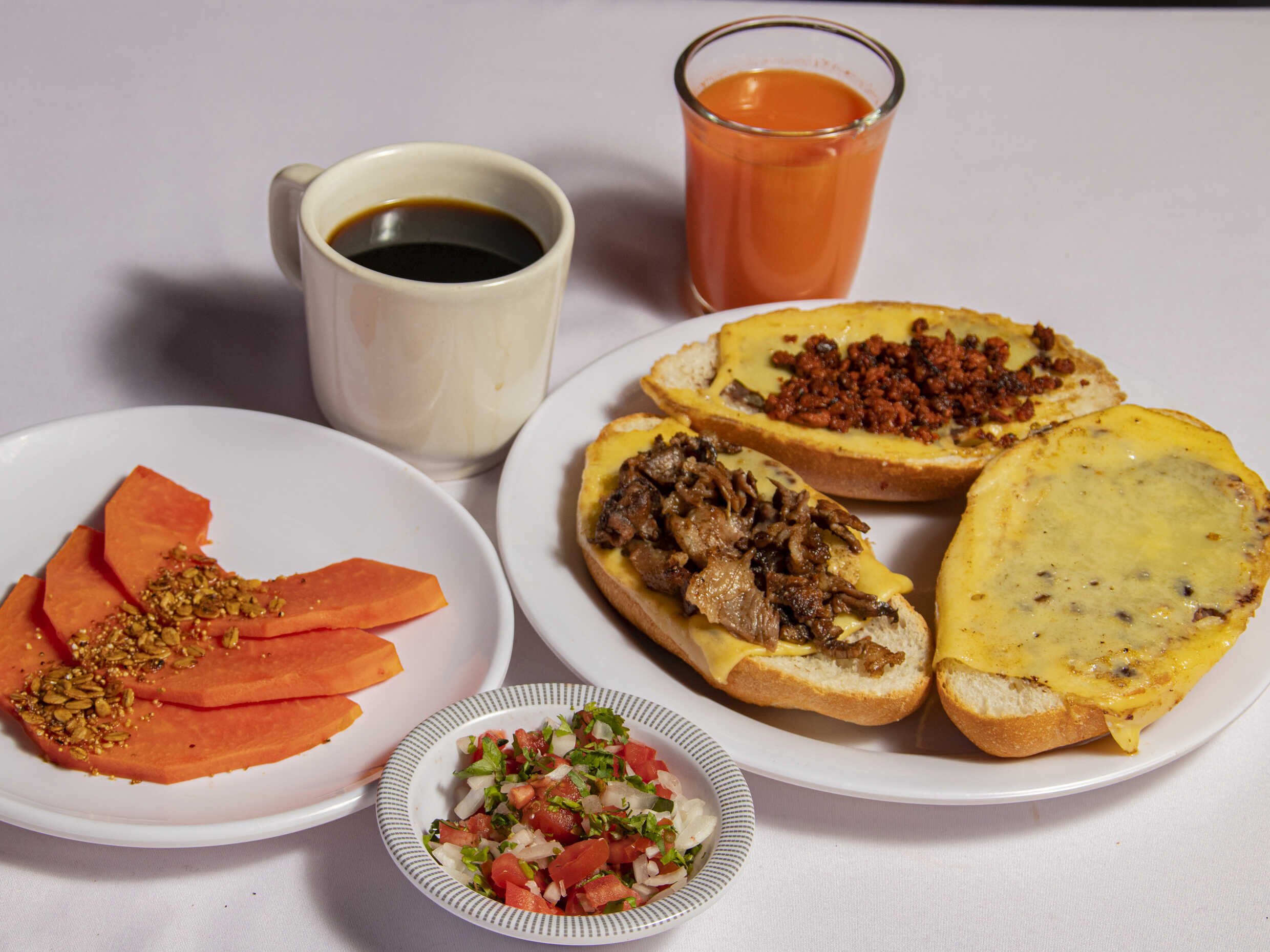 Tres molletes con queso manchego y frijoles refritos, acompañados de pico de gallo, café de olla y jugo o fruta