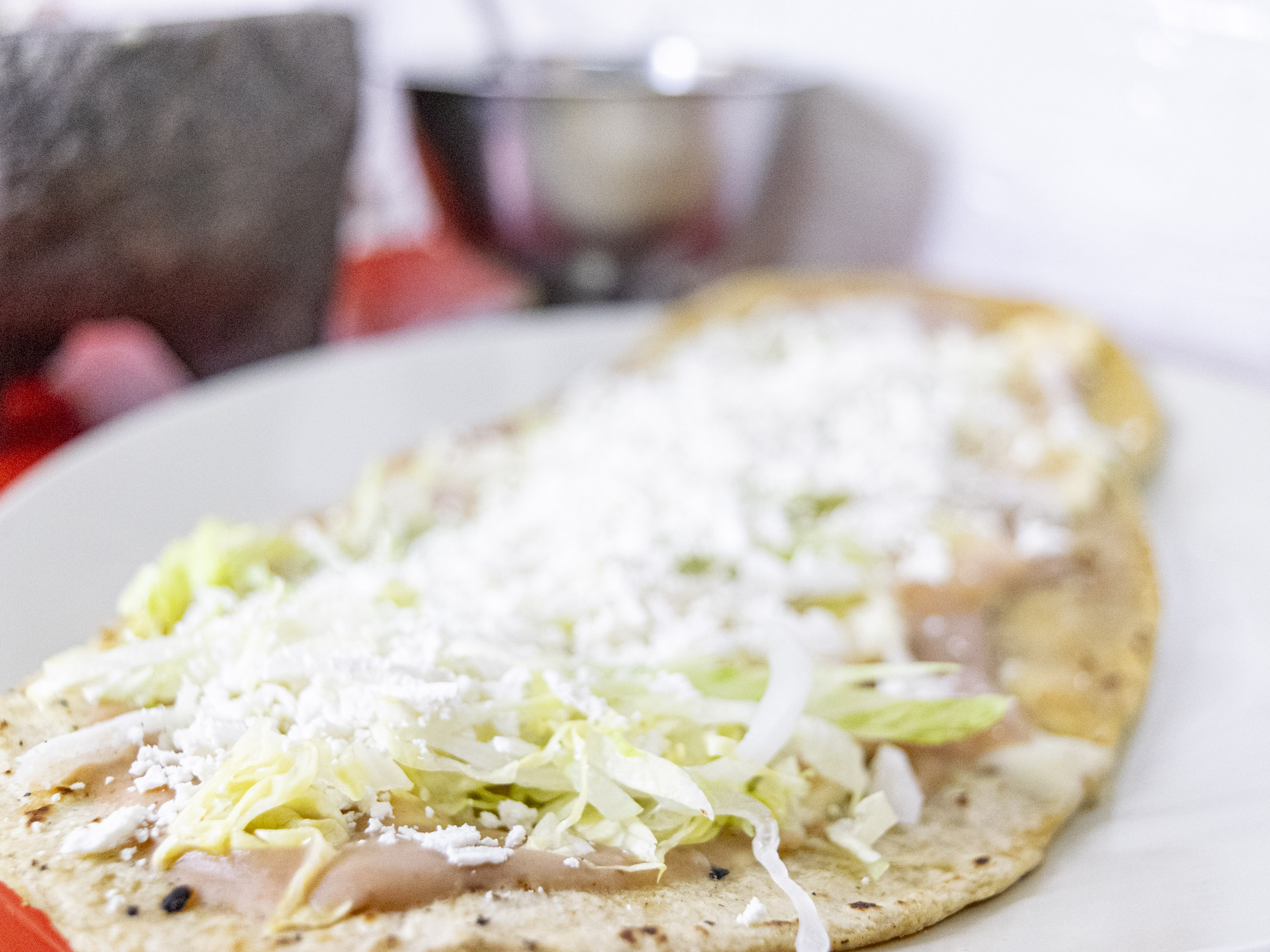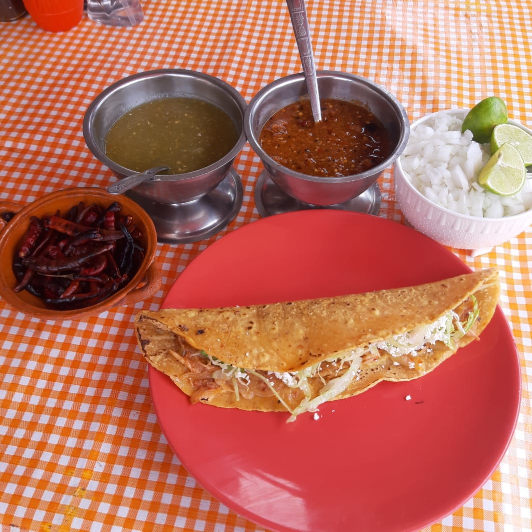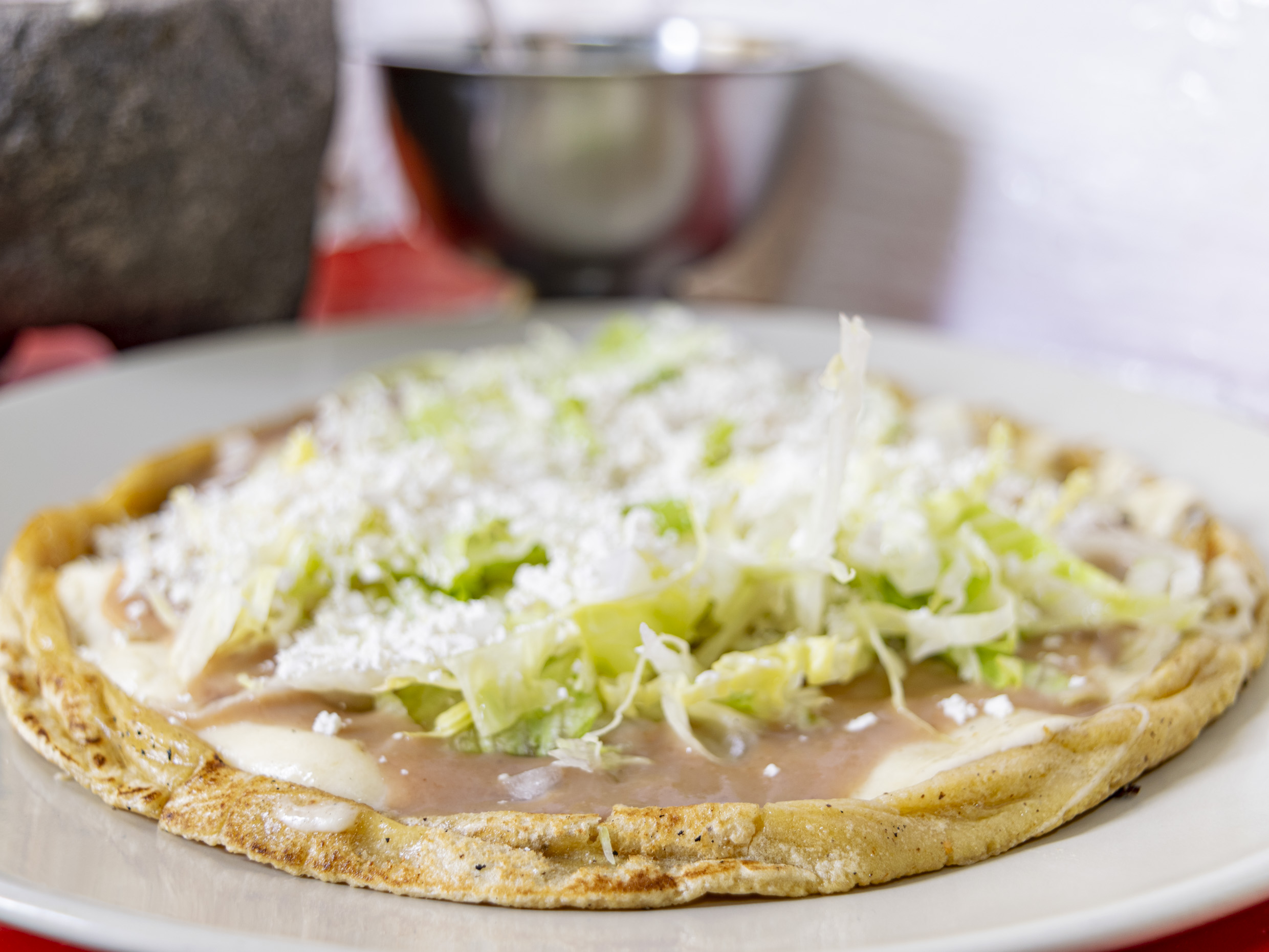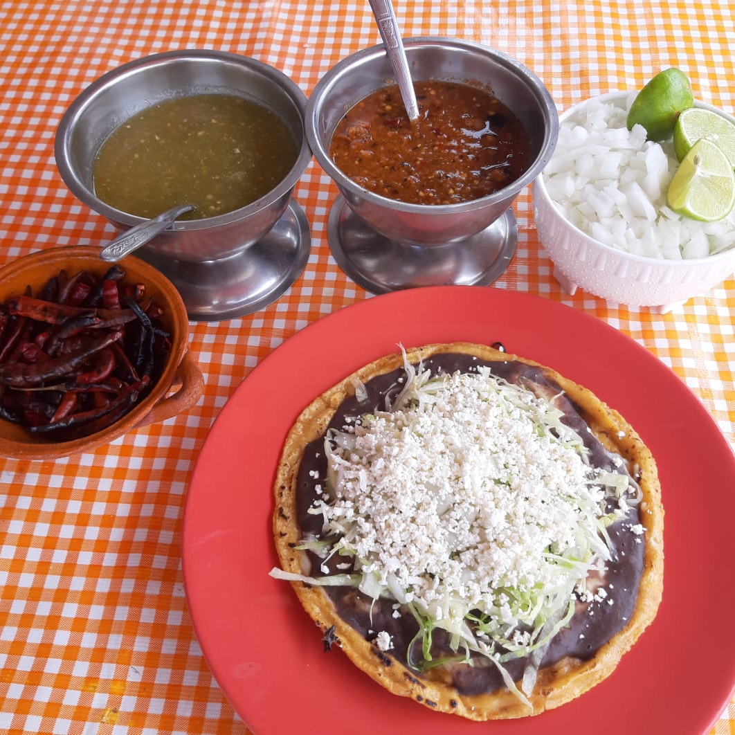Gordita de chicharrón aplastada tipo sope, frijoles, lechuga, cebolla y queso rallado.