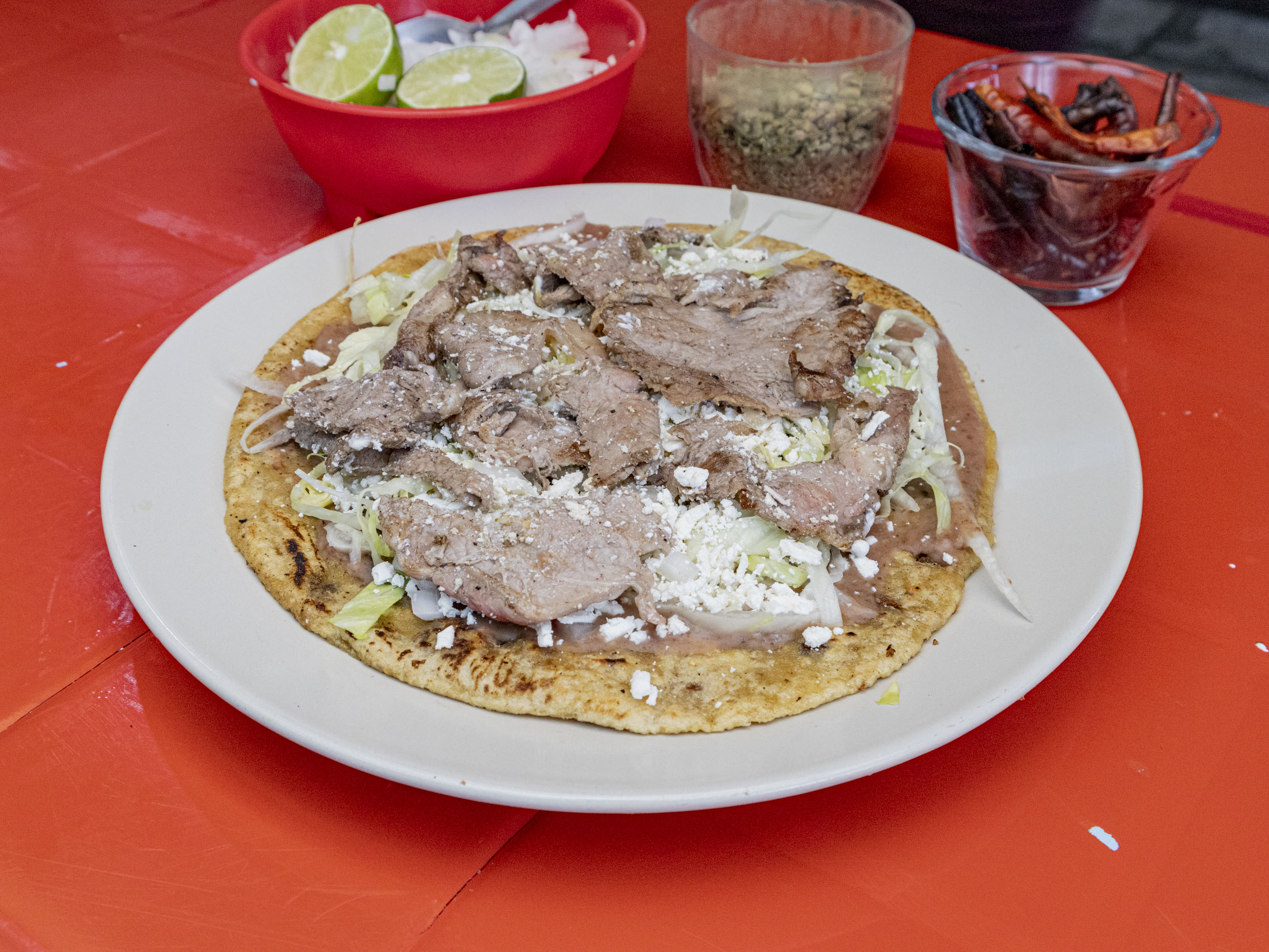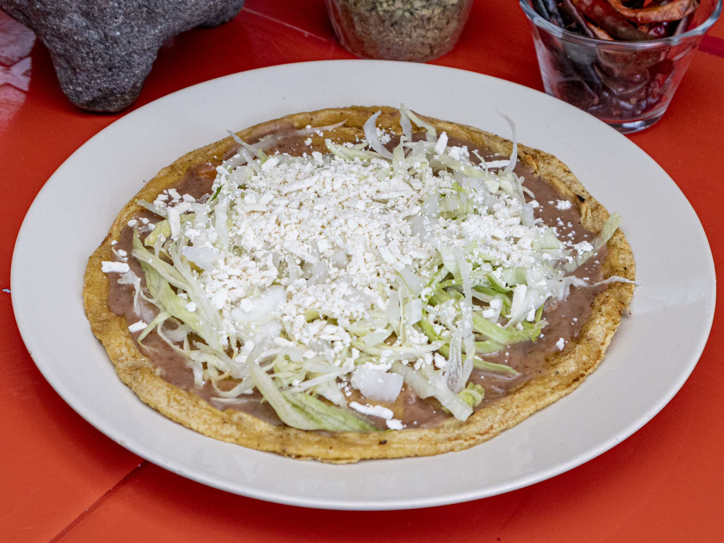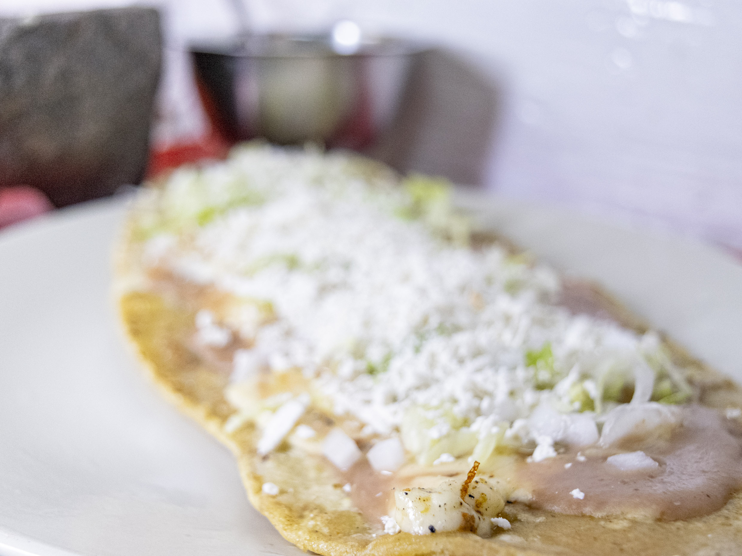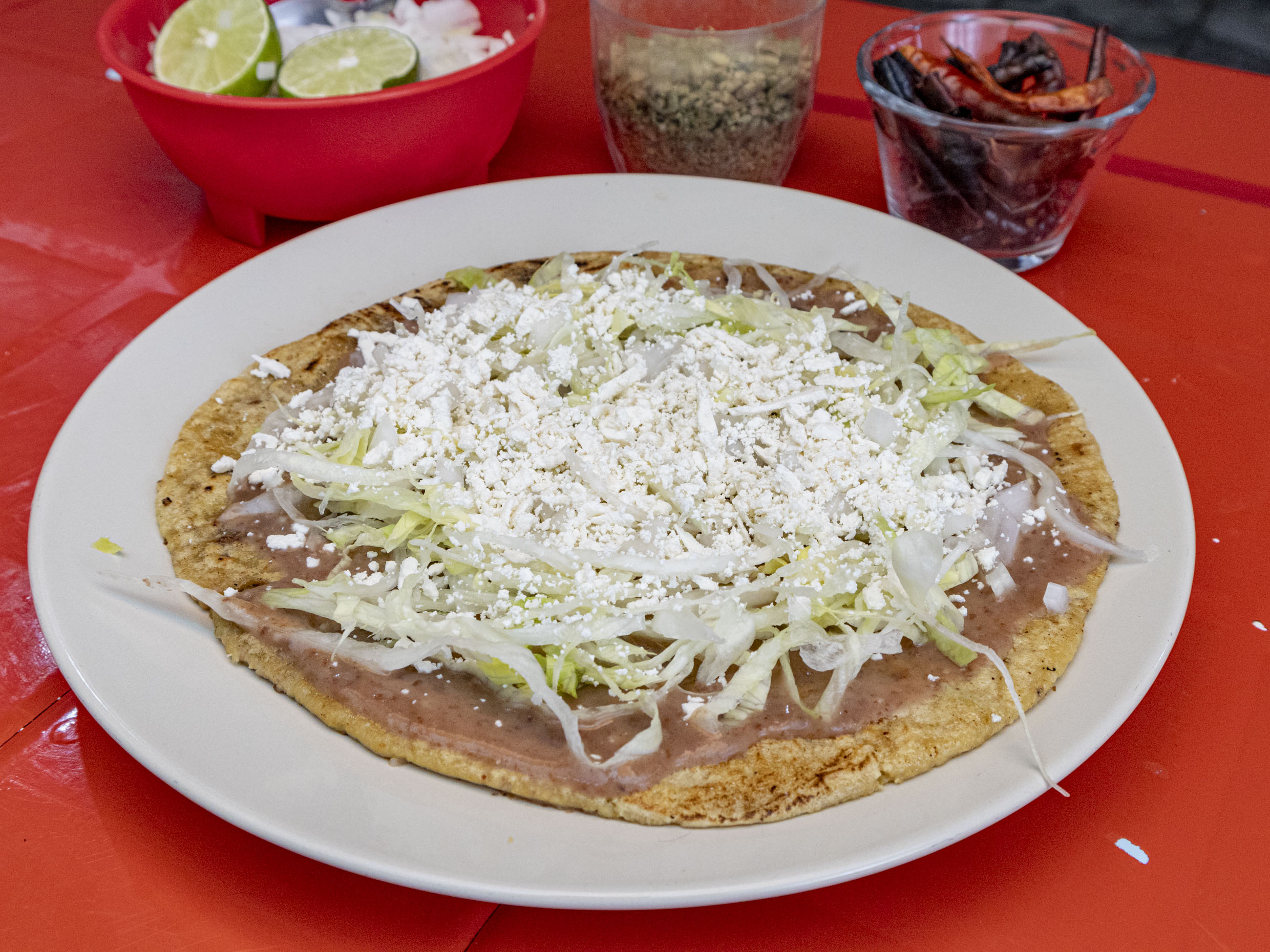Gordita de chicharrón aplastada tipo sope, frijoles, lechuga, cebolla y queso rallado.