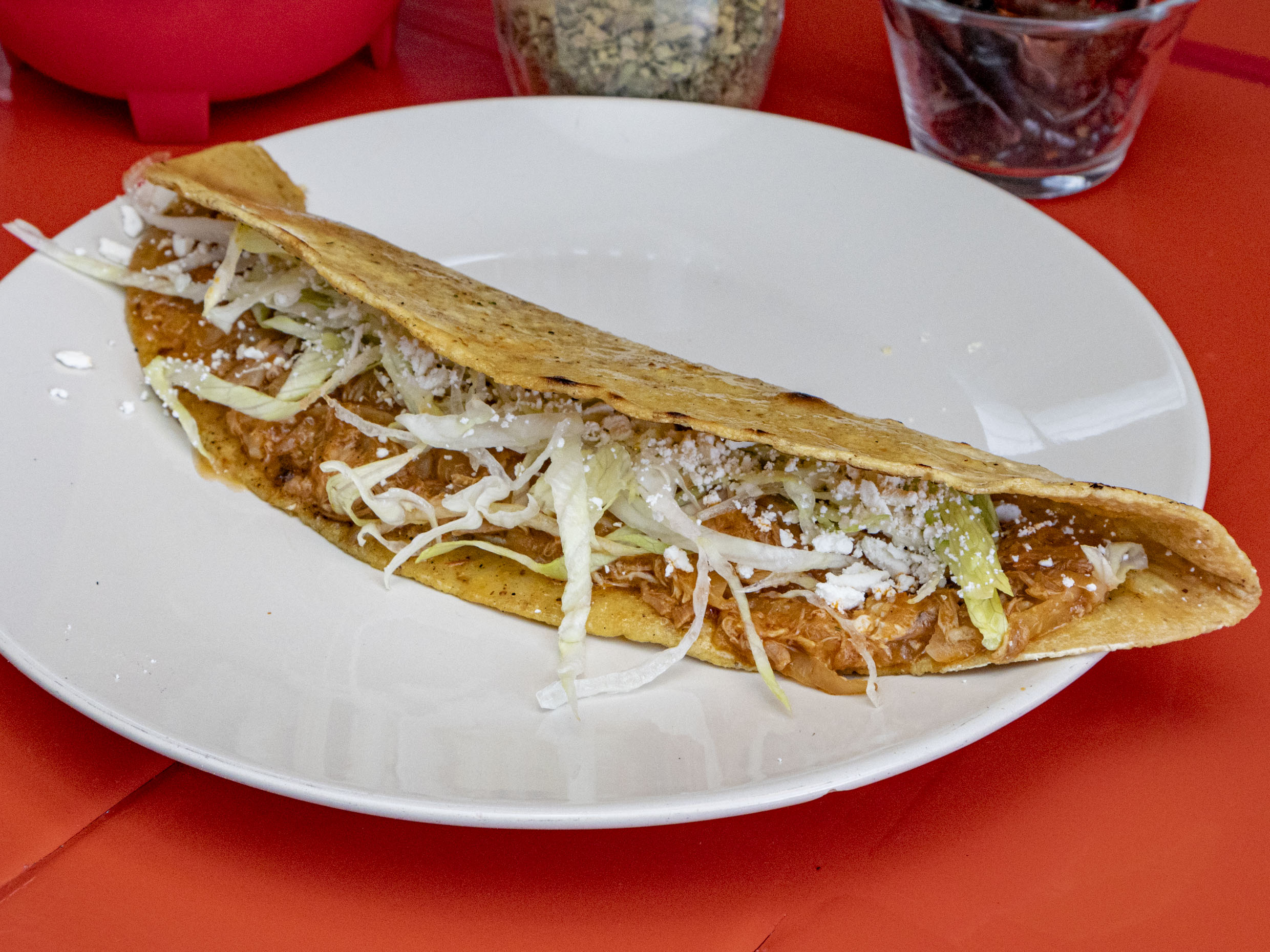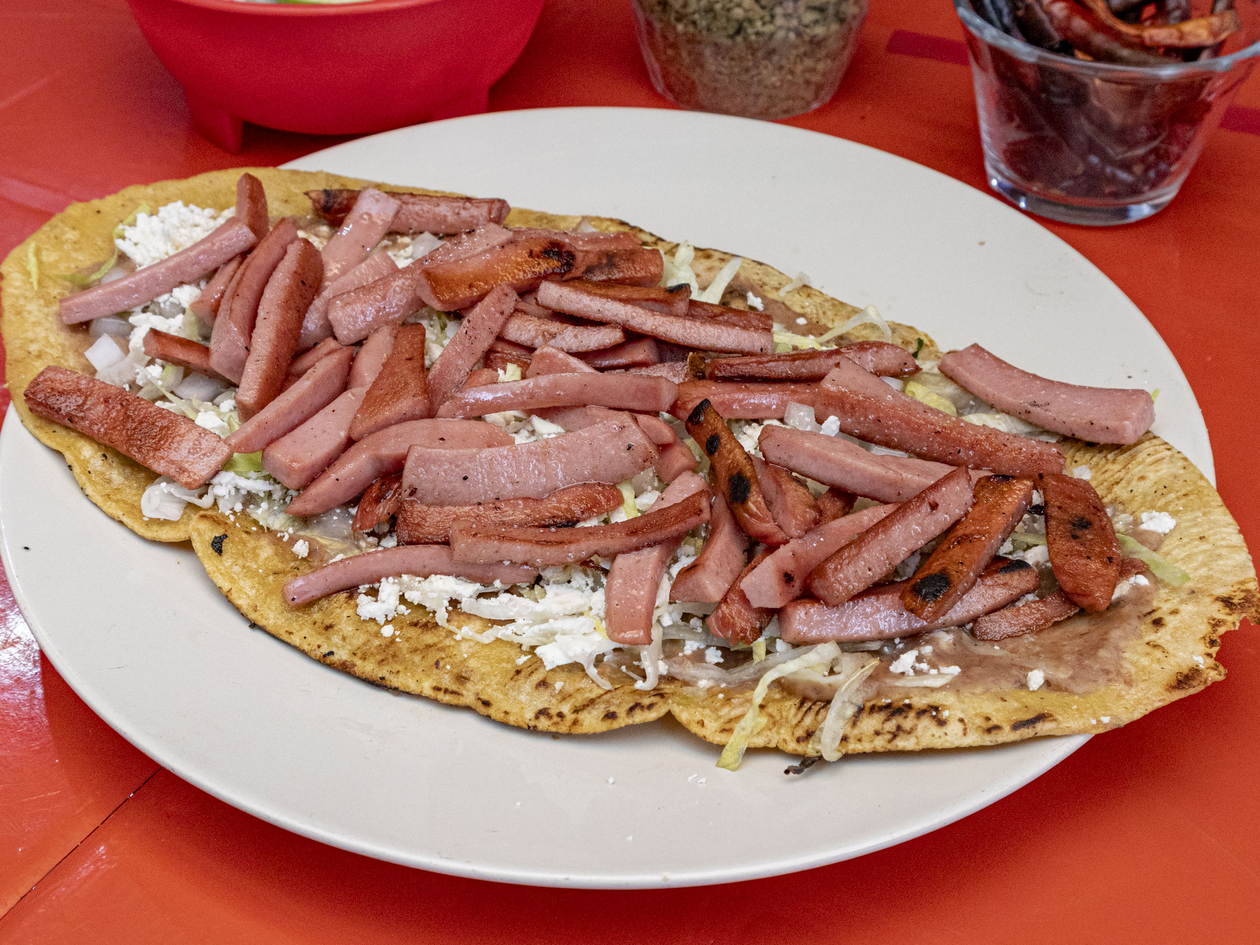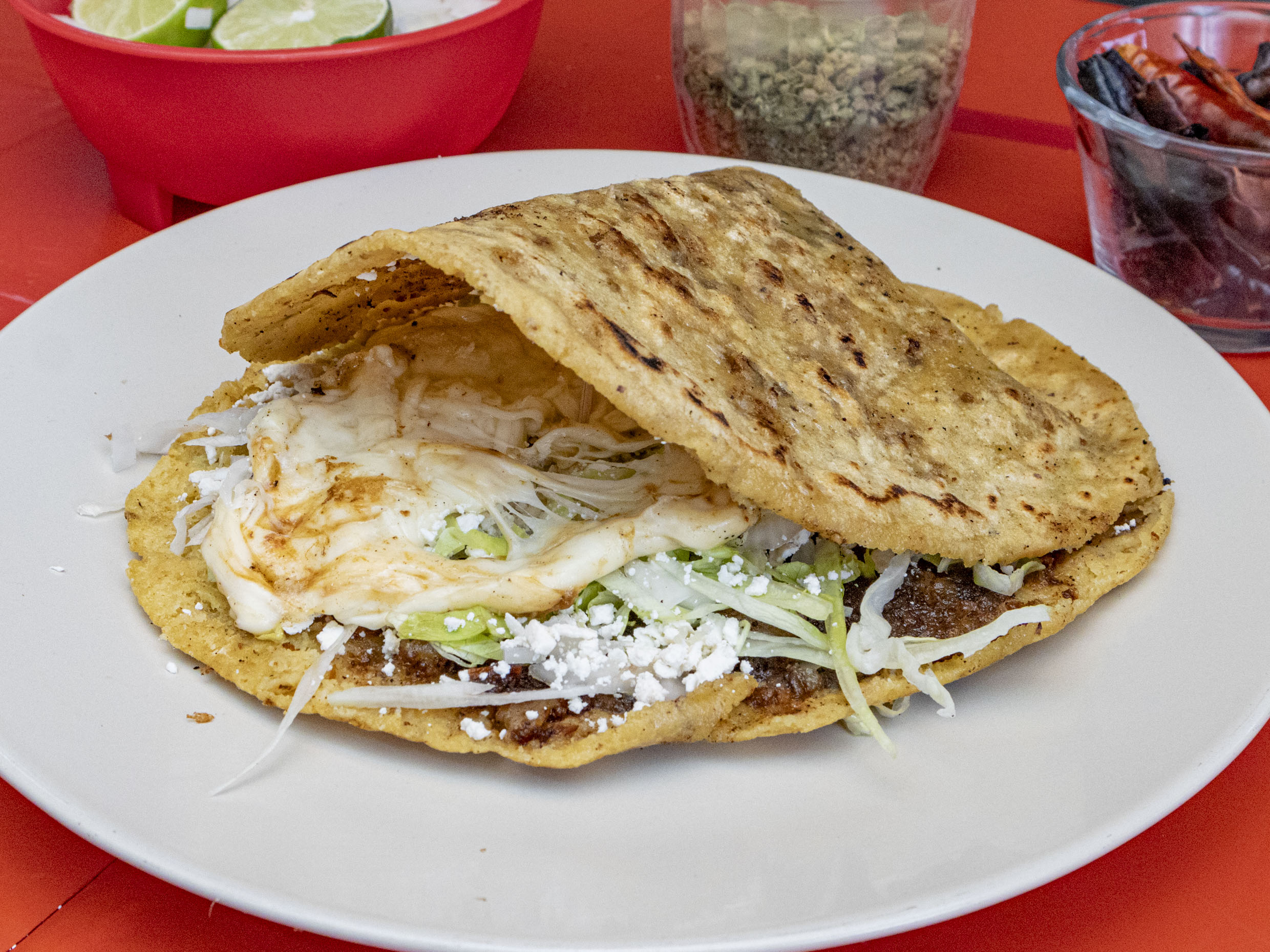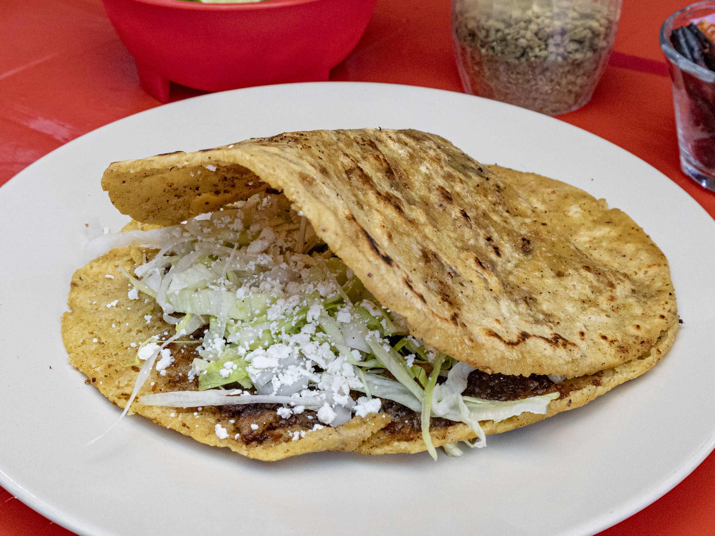 Gordita de chicharrón aplastada tipo sope, frijoles, lechuga, cebolla y queso rallado.