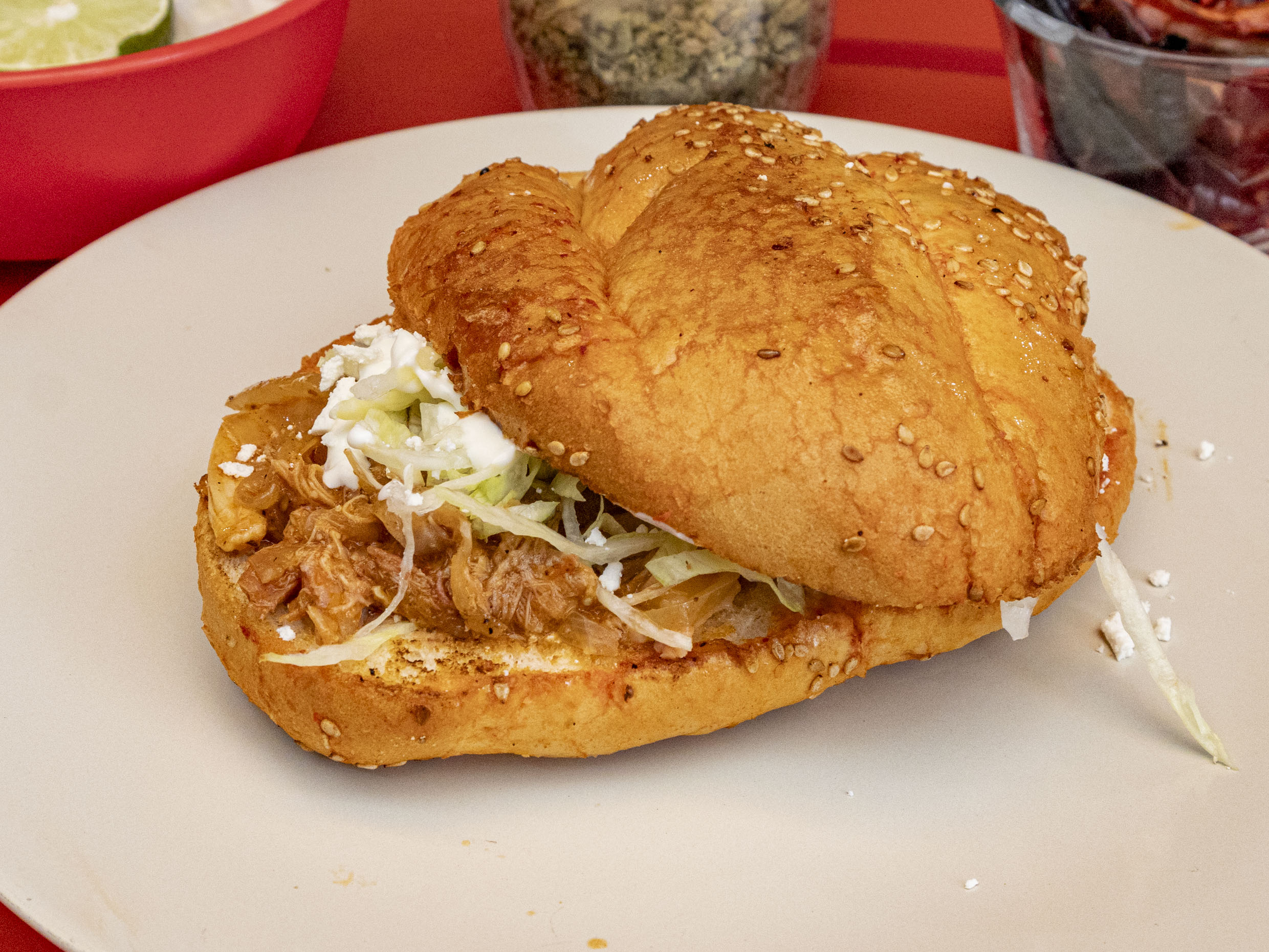 Pechuga de gallina desebrada, lechuga cebolla y queso ranchero.
